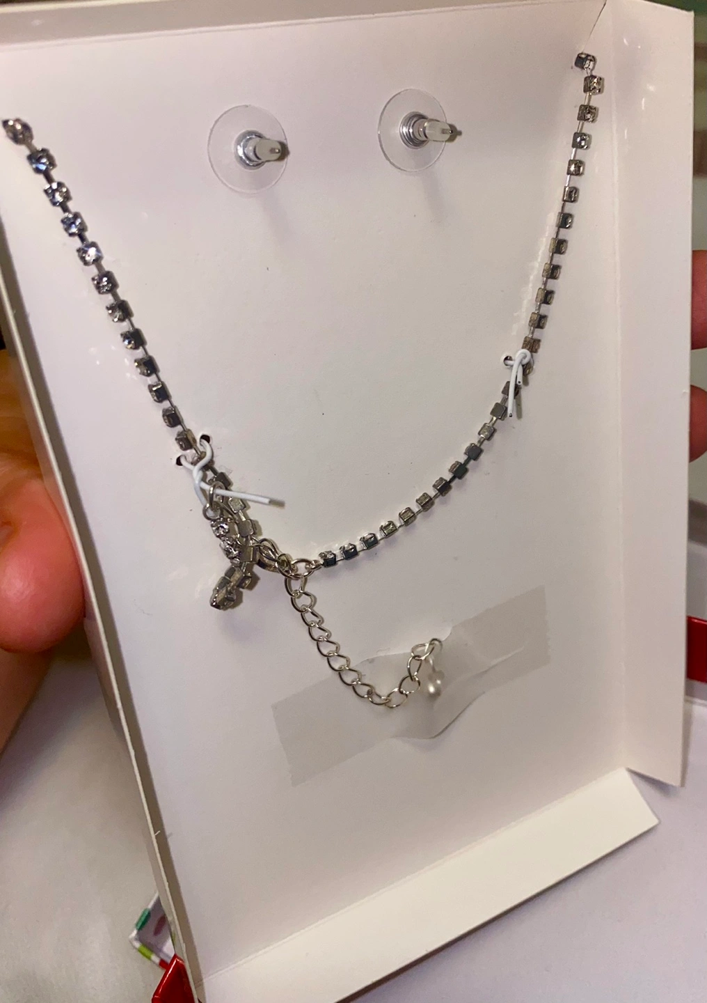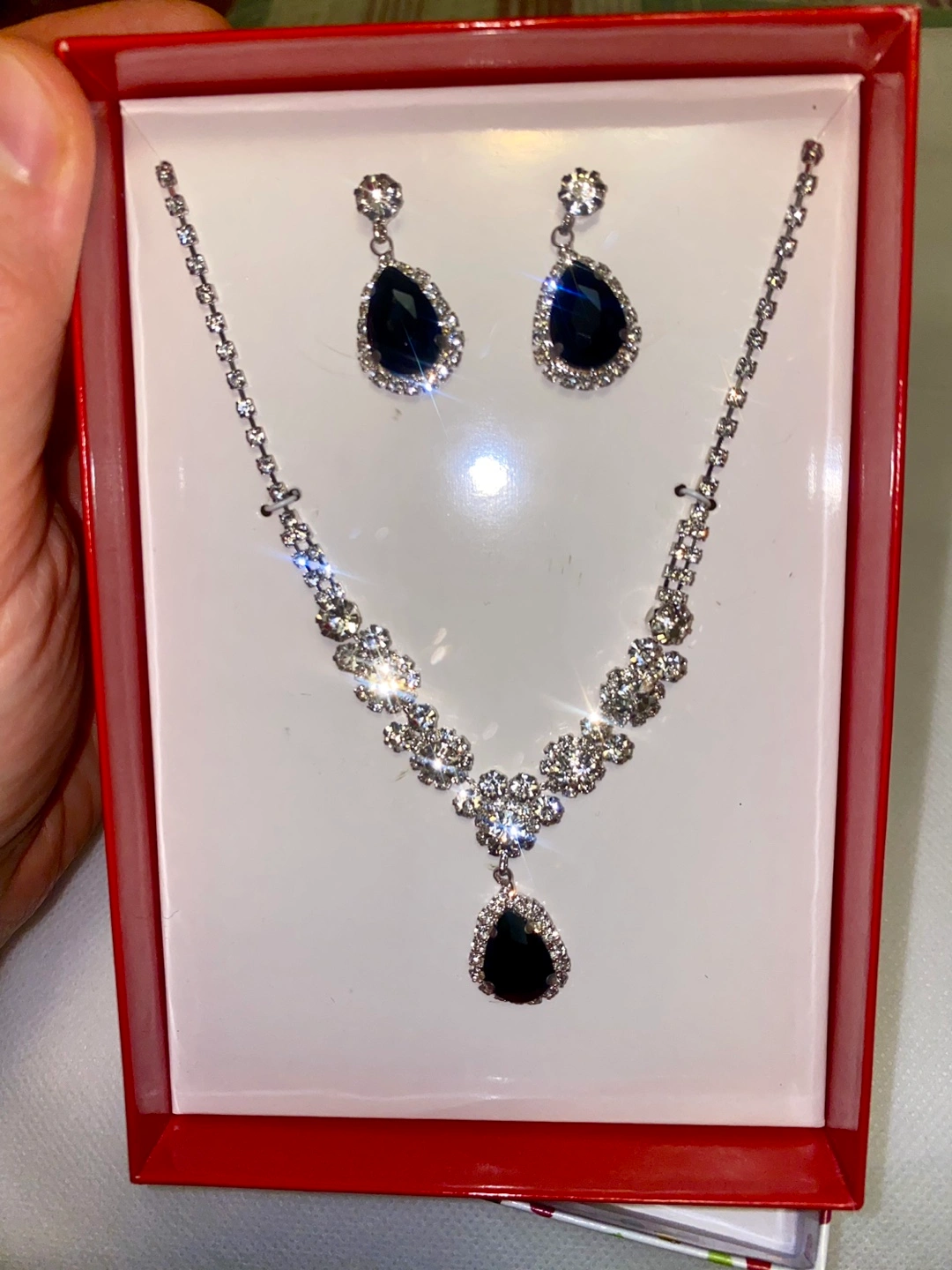 Blue and clear rhinestone necklace and earring set. The necklace has a teardrop pendant and the earrings have teardrop stones.