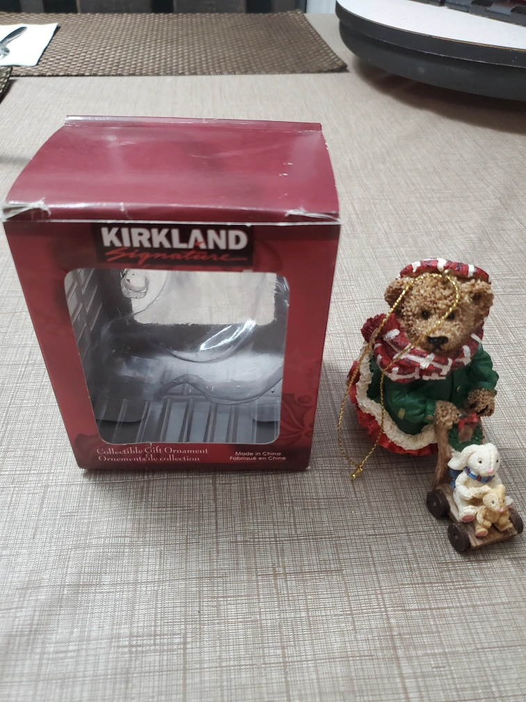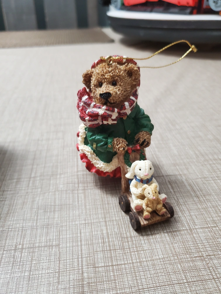 Christmas ornament featuring a bear wearing a red and green scarf and pulling a toy wagon with two bunnies. Comes in original box.