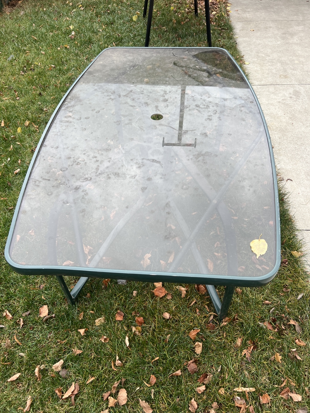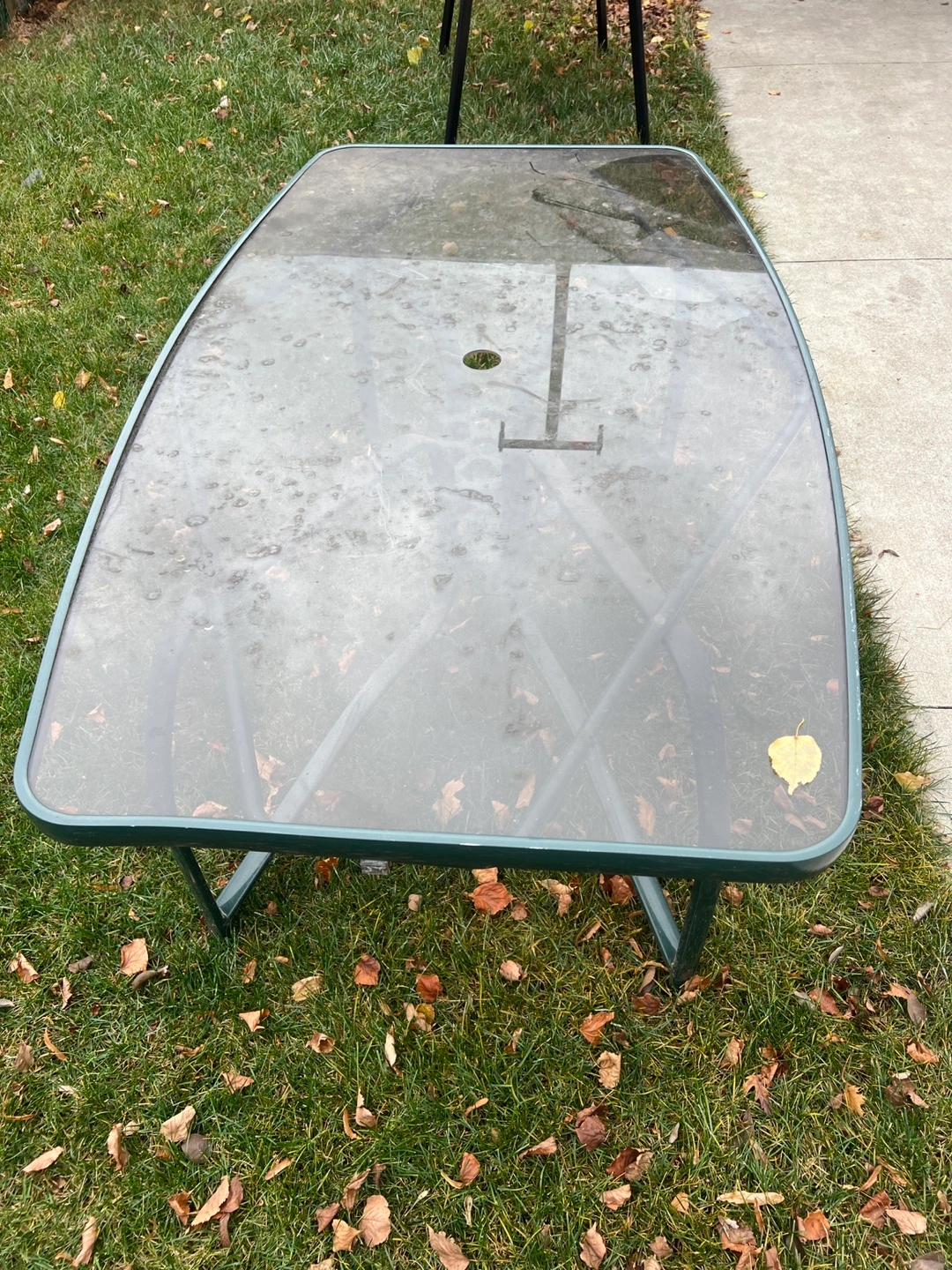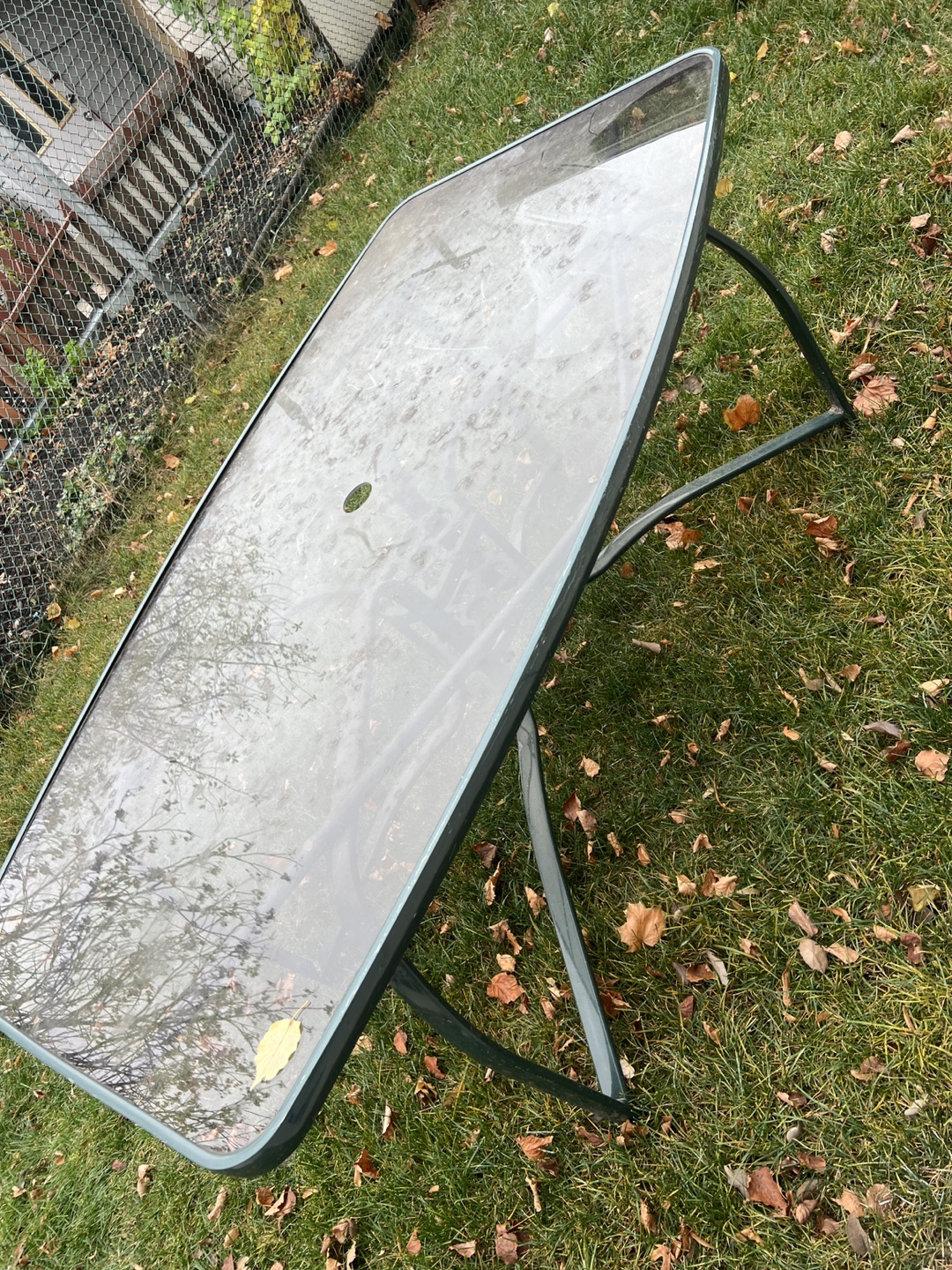 Glass top patio table with metal frame. Table is in good condition and strong. Priced to sell. Lansdowne and college pickup
