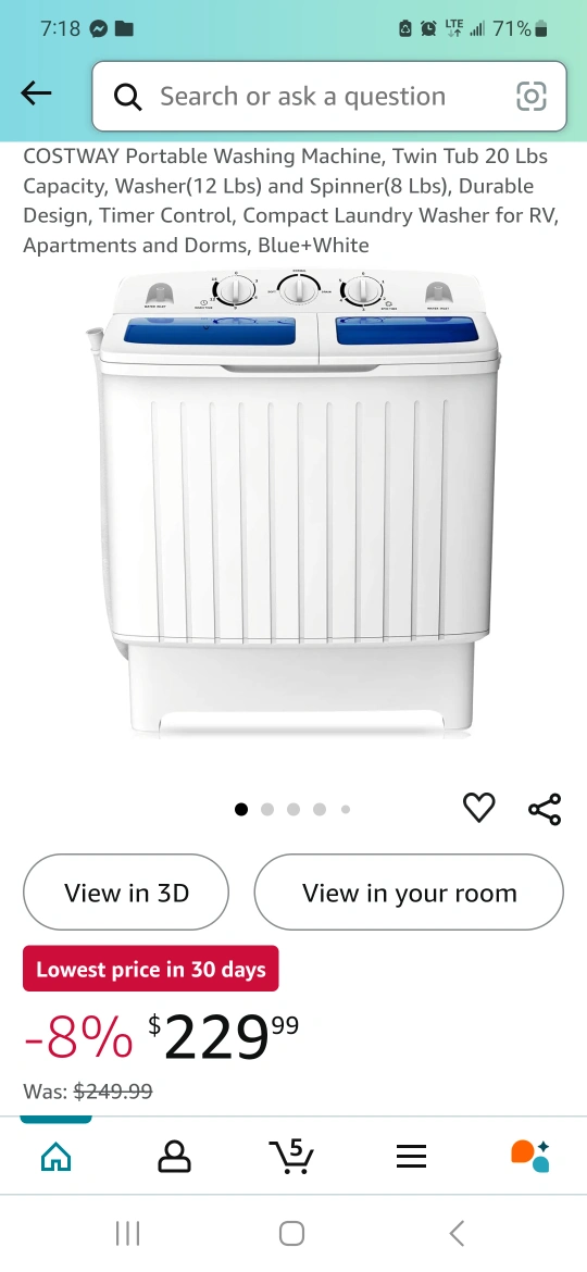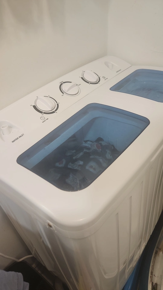 Portable twin tub washing machine. Washer and spinner. 12 lbs capacity washer and 8 lbs capacity spinner. Has timer control and water inlet.