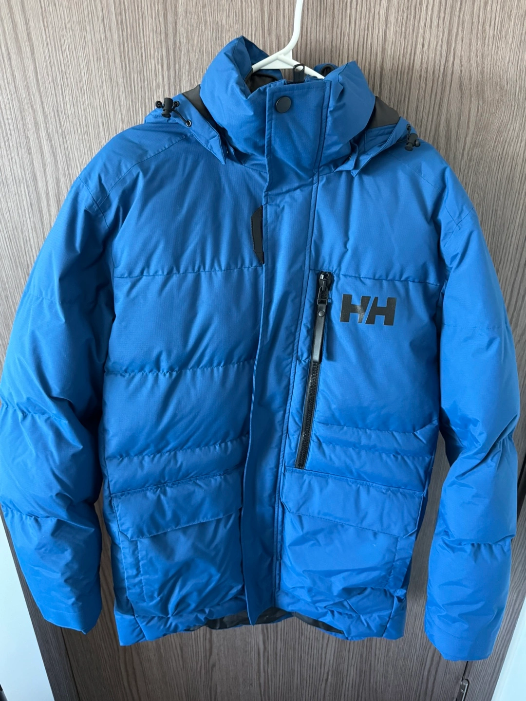Men's blue puffer jacket. Has a hood. Size Medium.