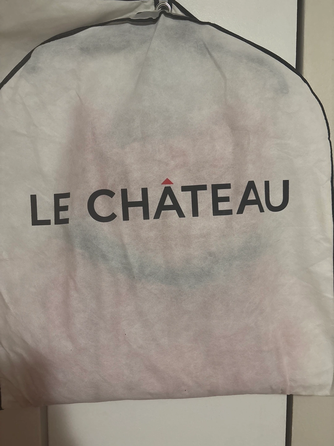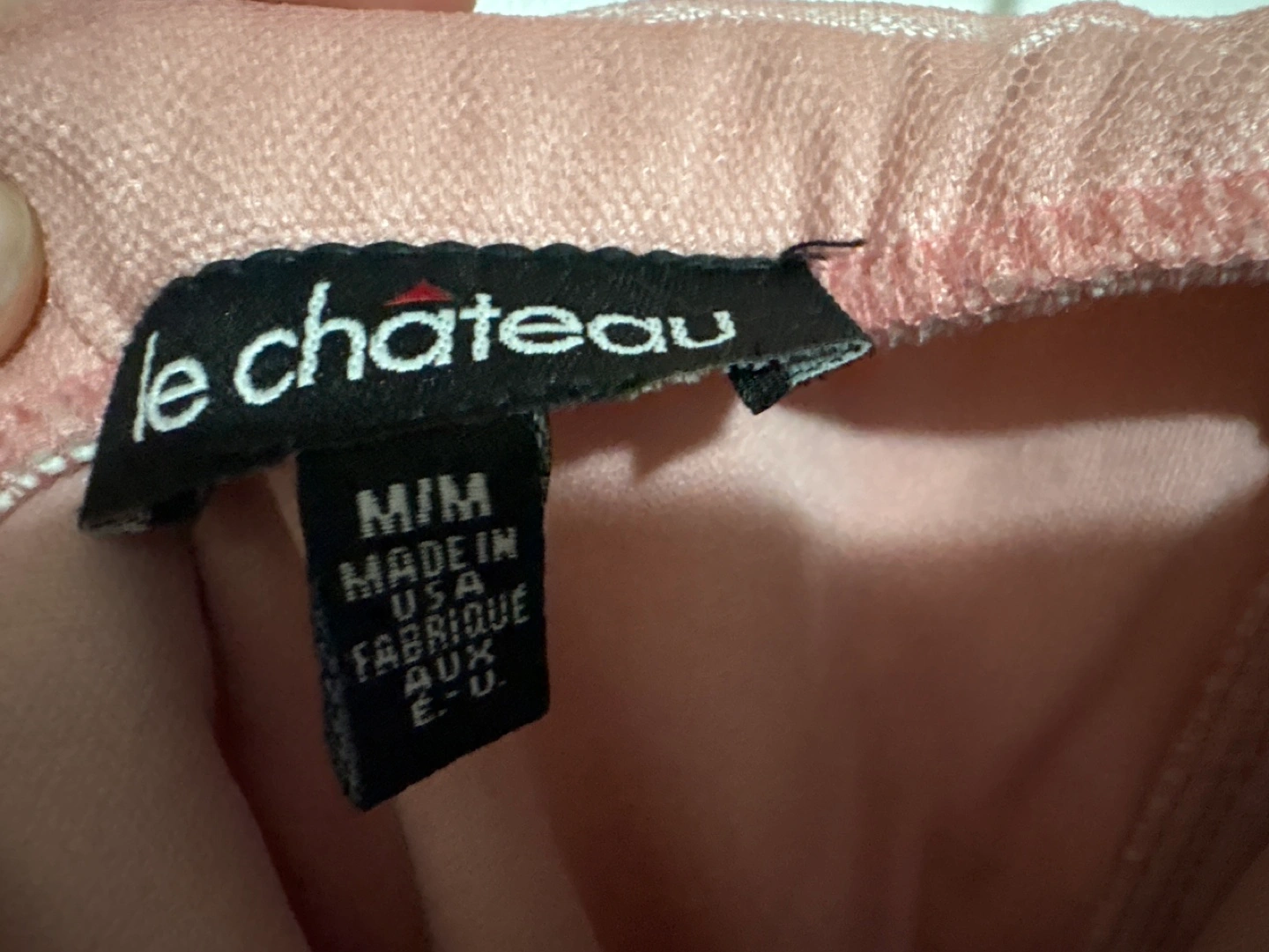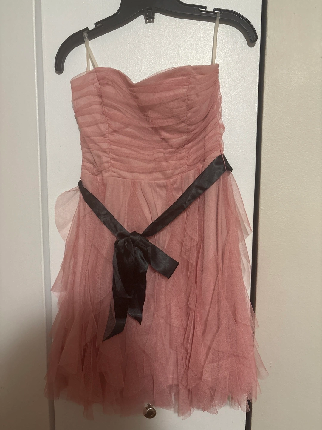 Pink strapless dress with black ribbon and a ruffled bottom. Size medium. From le chateau. Worn once