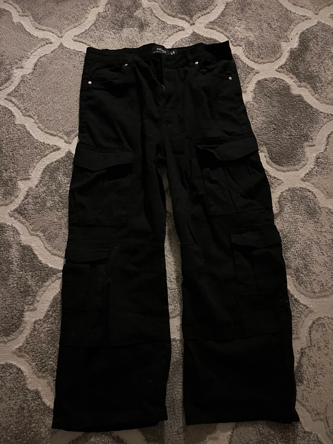 Black cargo pants with multiple pockets. It doesn’t fit well on me i bought it but never once worn it out. the white lint is from a cardigan it’s not old