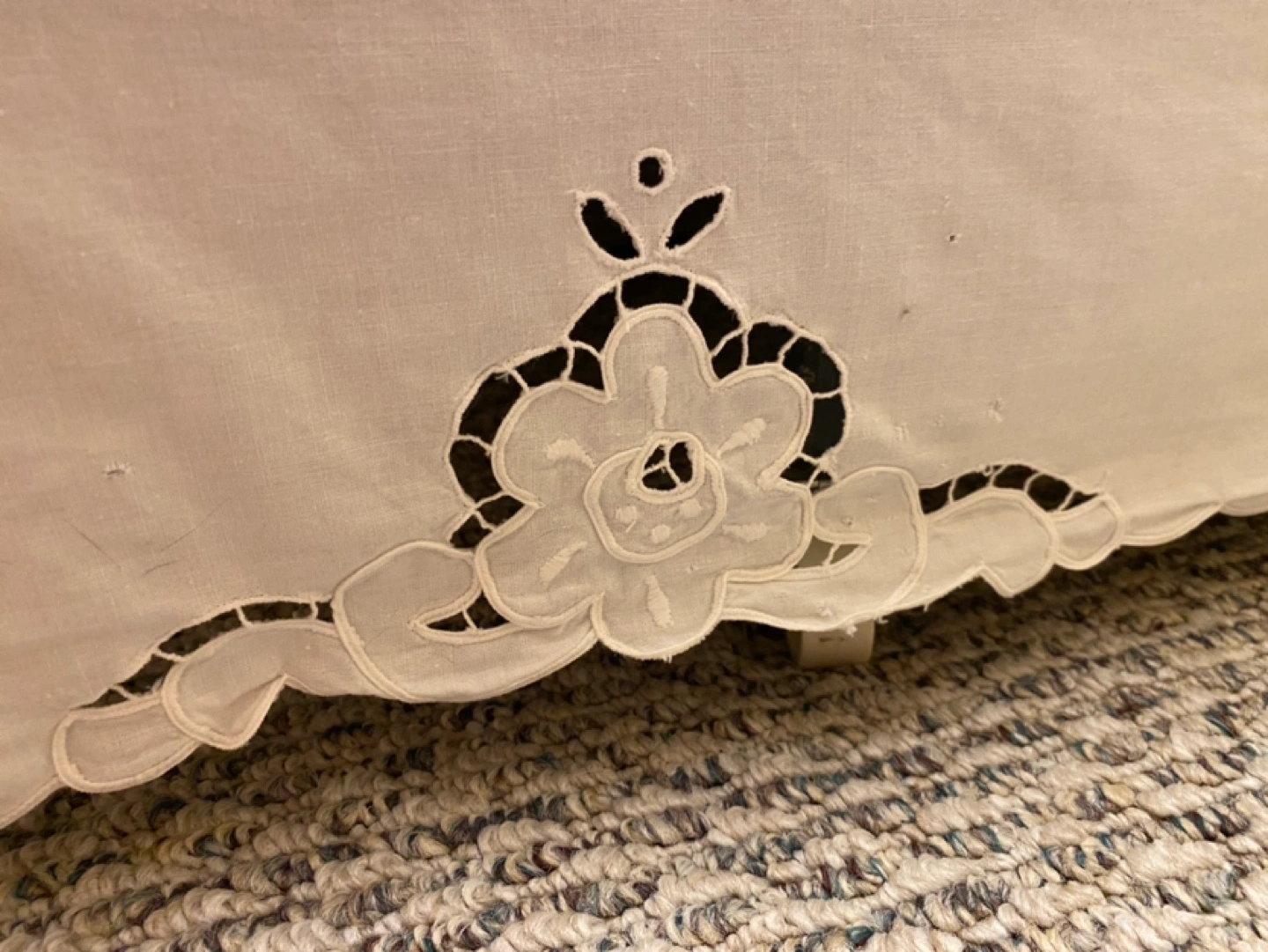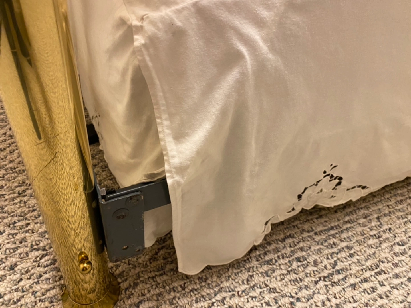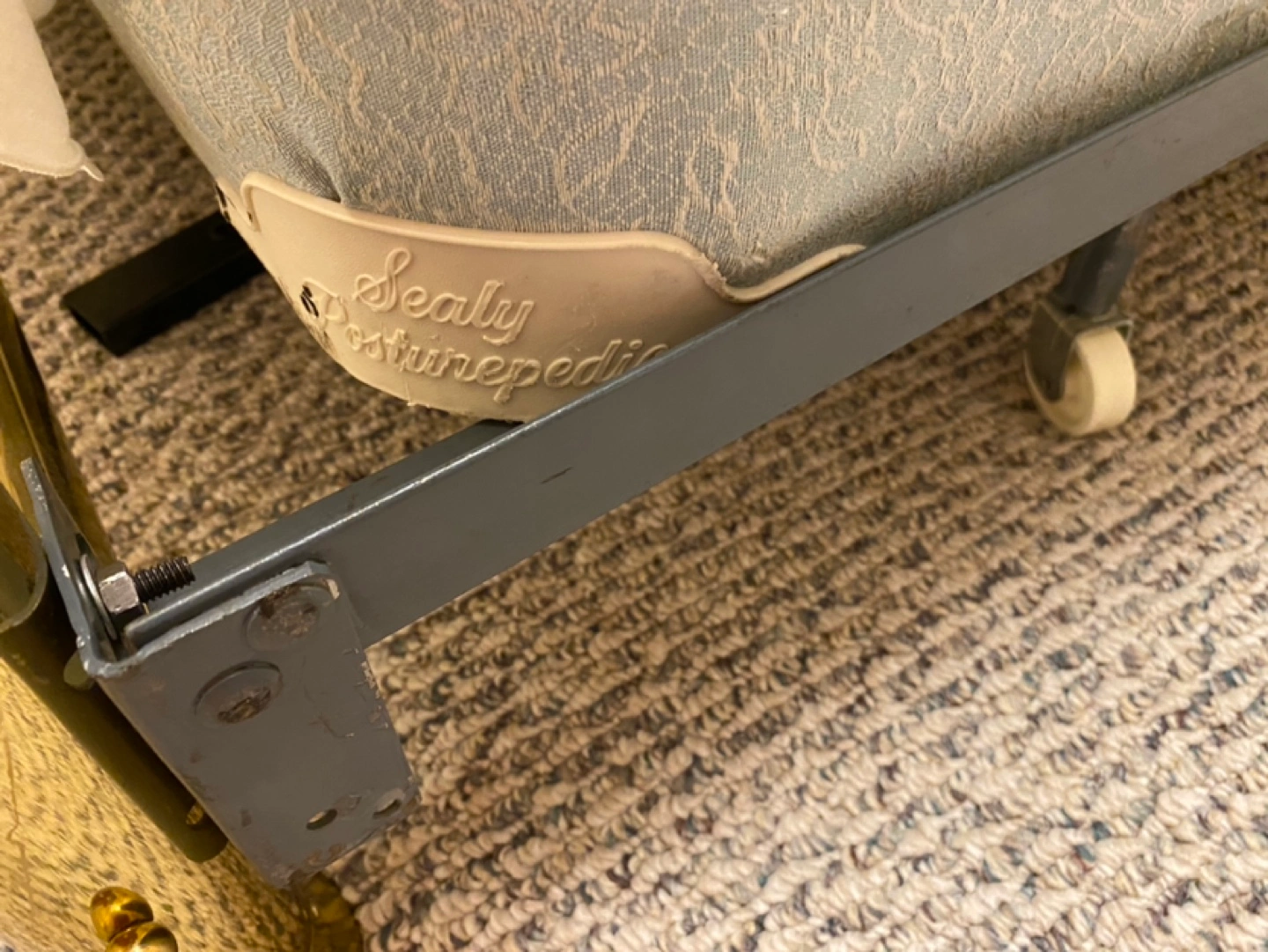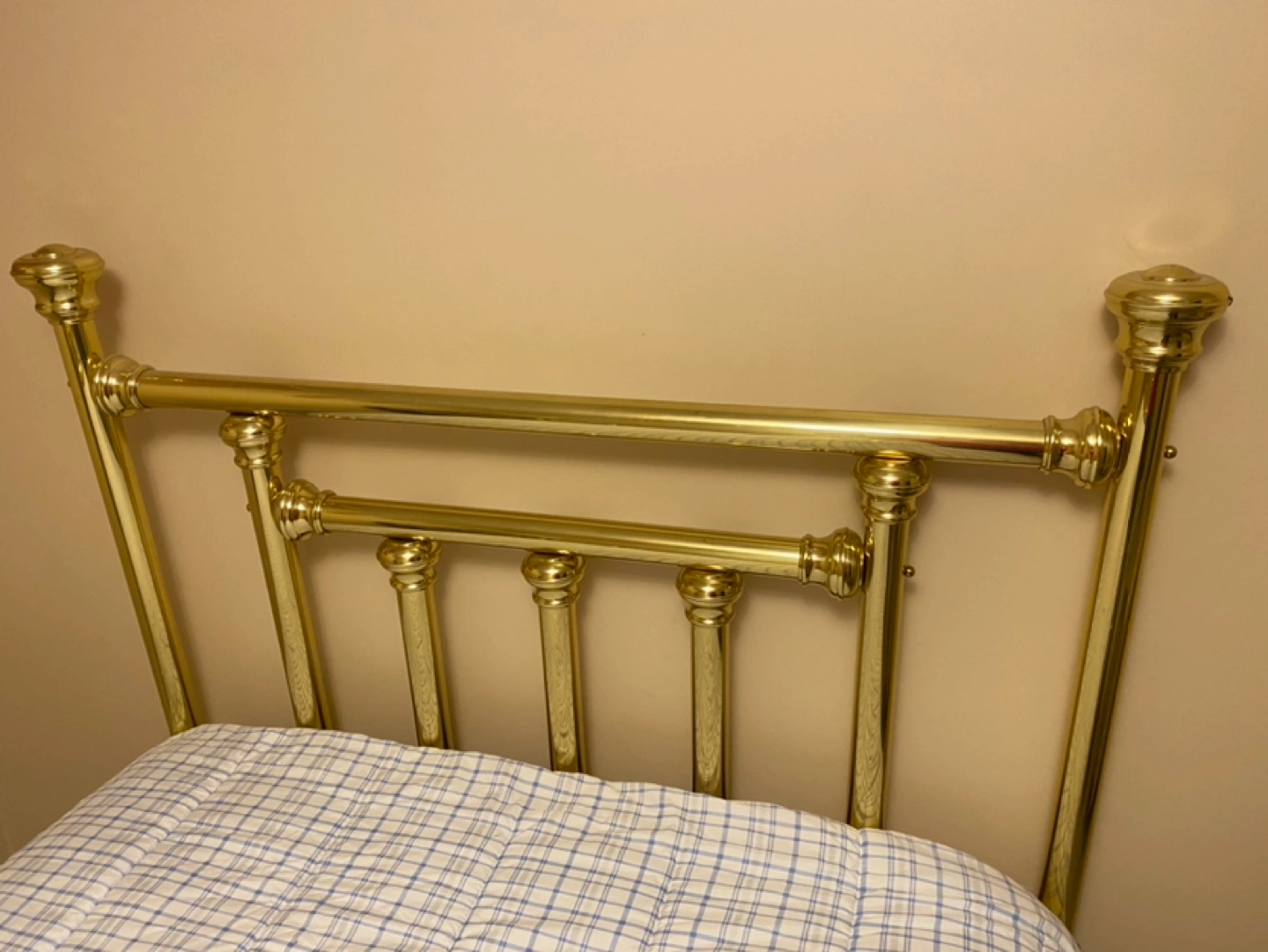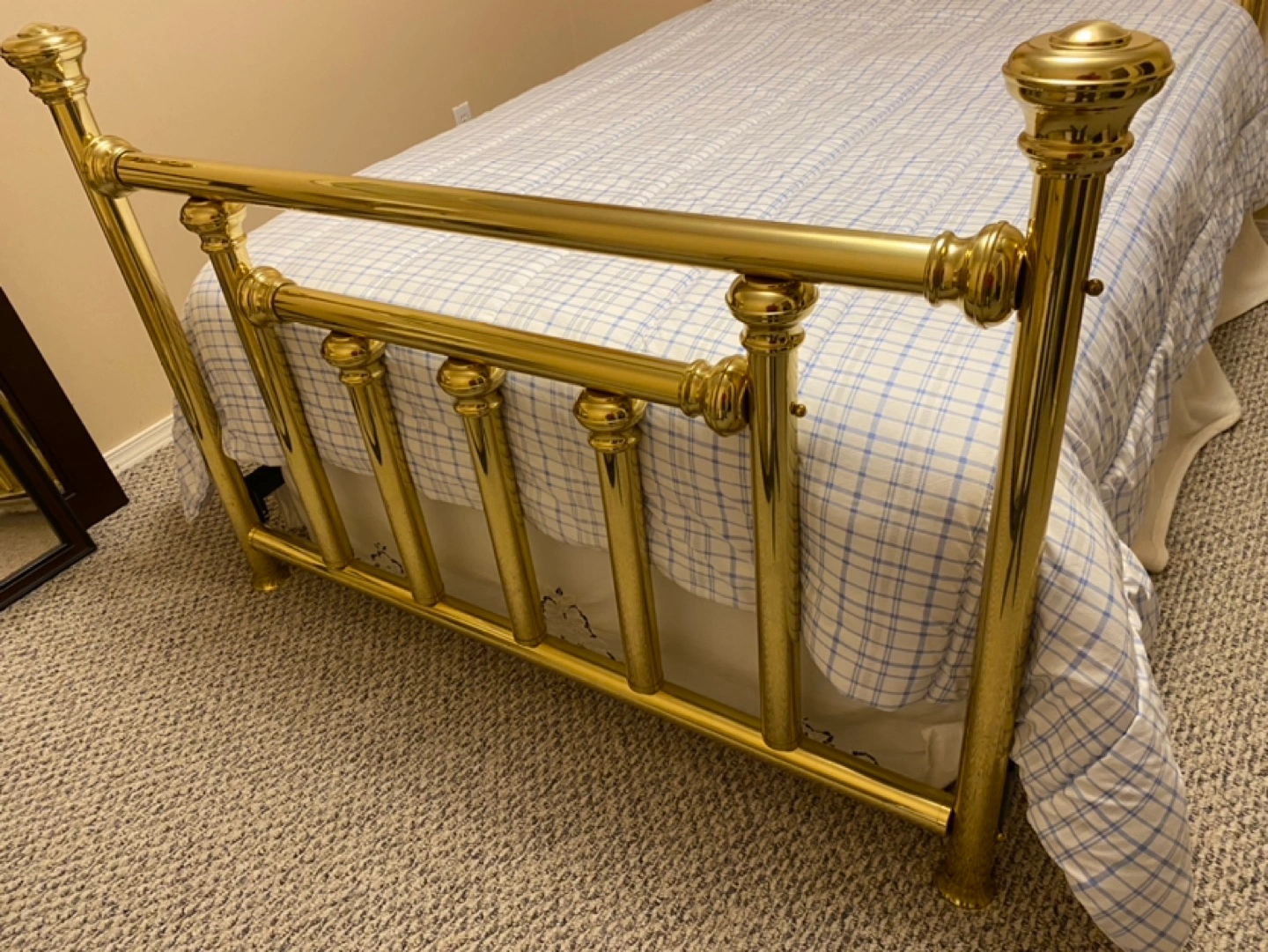 Double bed frame made of brass with a headboard and footboard. Includes mattress and Sealy Posturepedic box spring. The bed has wheels for easy moving. Also includes a battenburg lace bed skirt