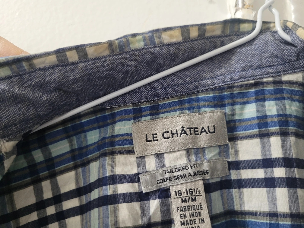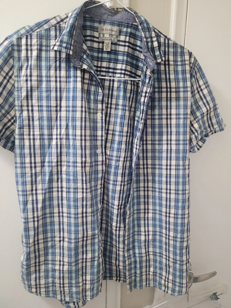 Blue and white plaid short sleeve button up shirt. Men's size medium. 🎈NOTE**** The collar is stained yellowish(see 2nd photo). A good stain remover product might be needed to remove stain.