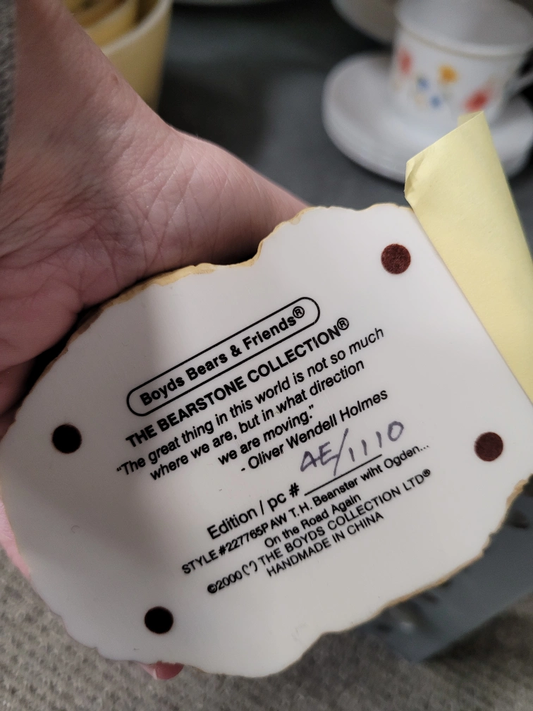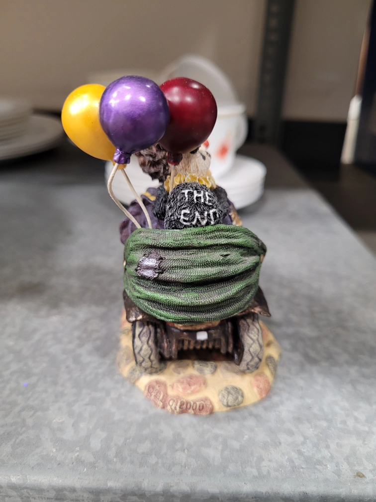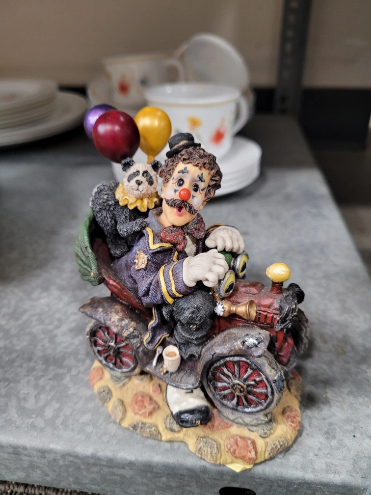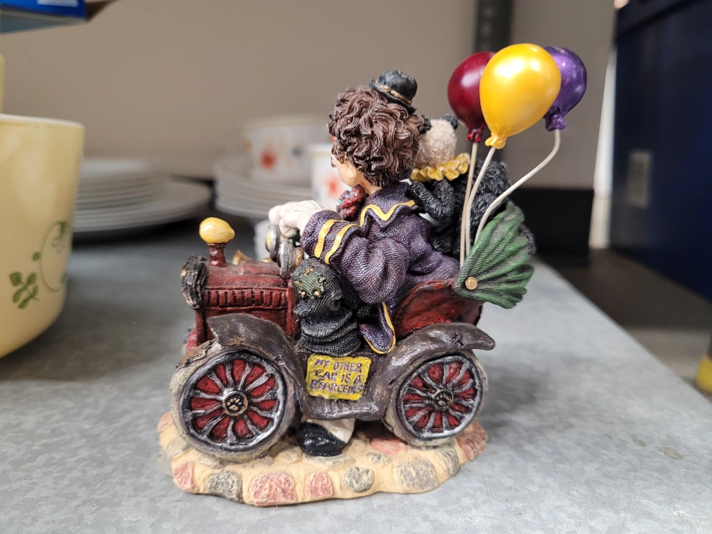 Clown figurine driving a car with a panda in the passenger seat, holding balloons. Part of the Bearstone Collection by Boyds.