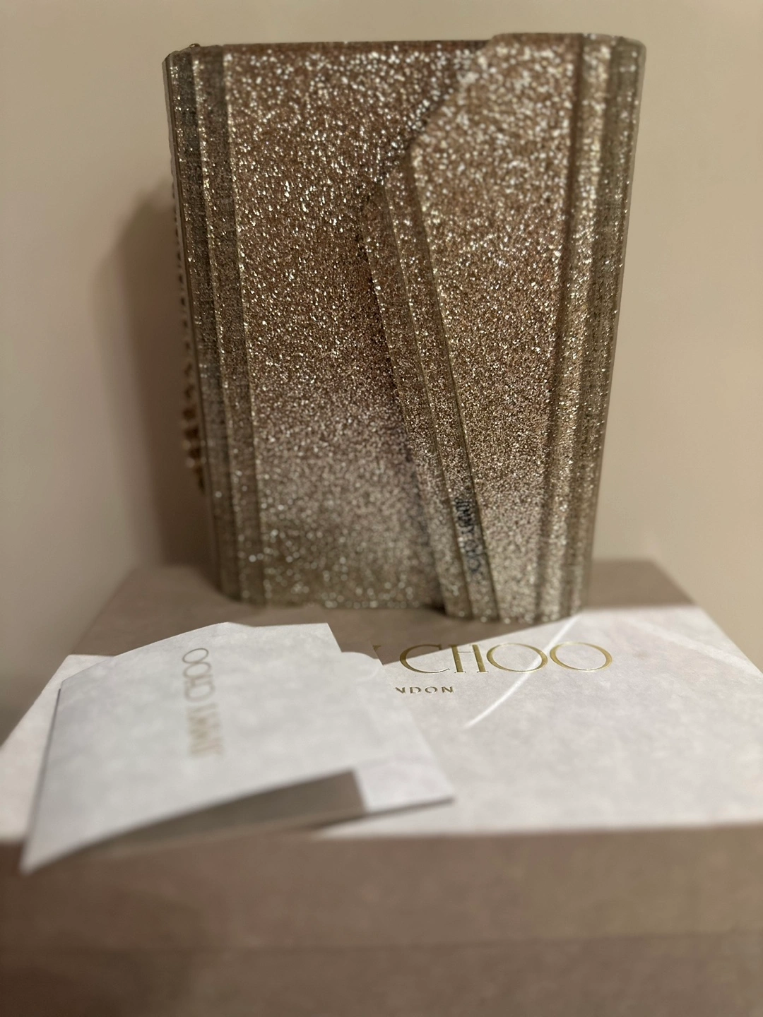 Gold glitter clutch with a unique design and Jimmy Choo branding. Comes with original dust bag and box.