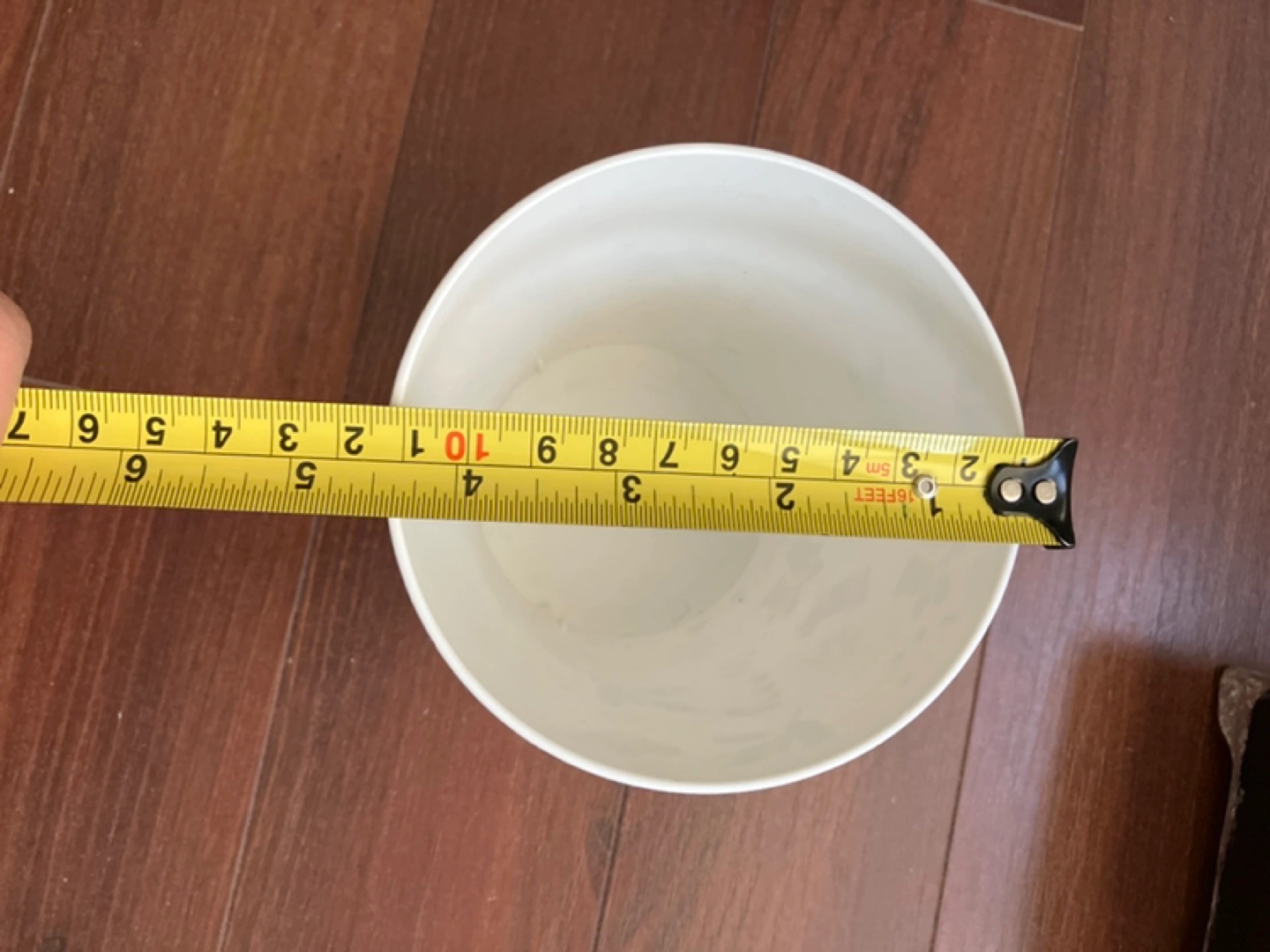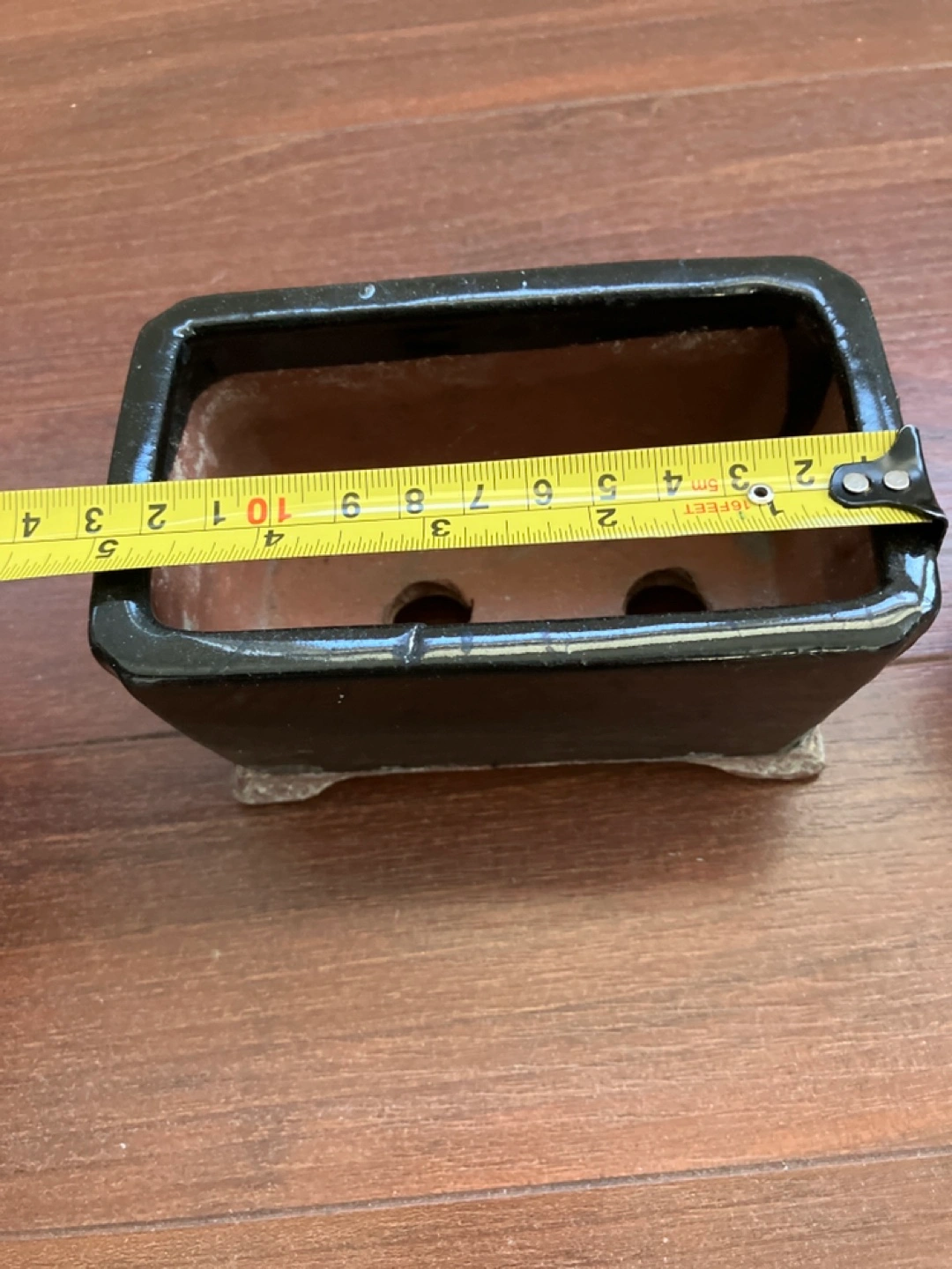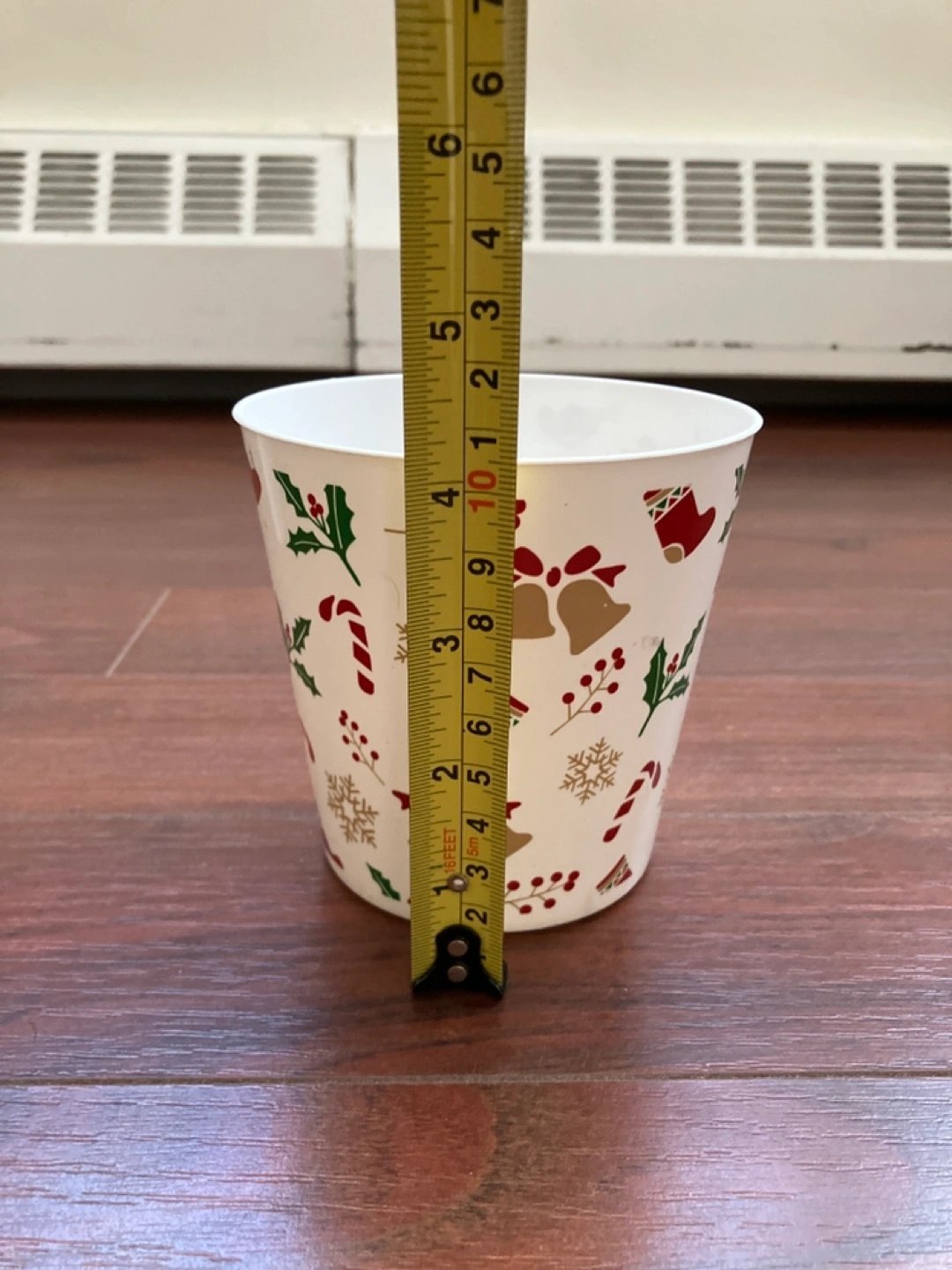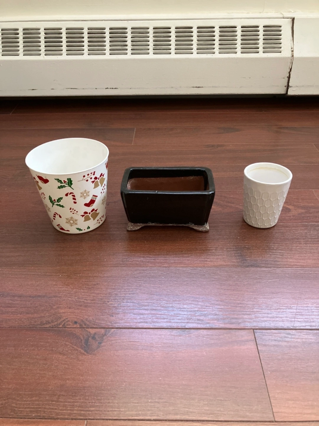 Three plant pots. One white pot with a Christmas design, one black rectangular pot, and one white pot with a geometric pattern.