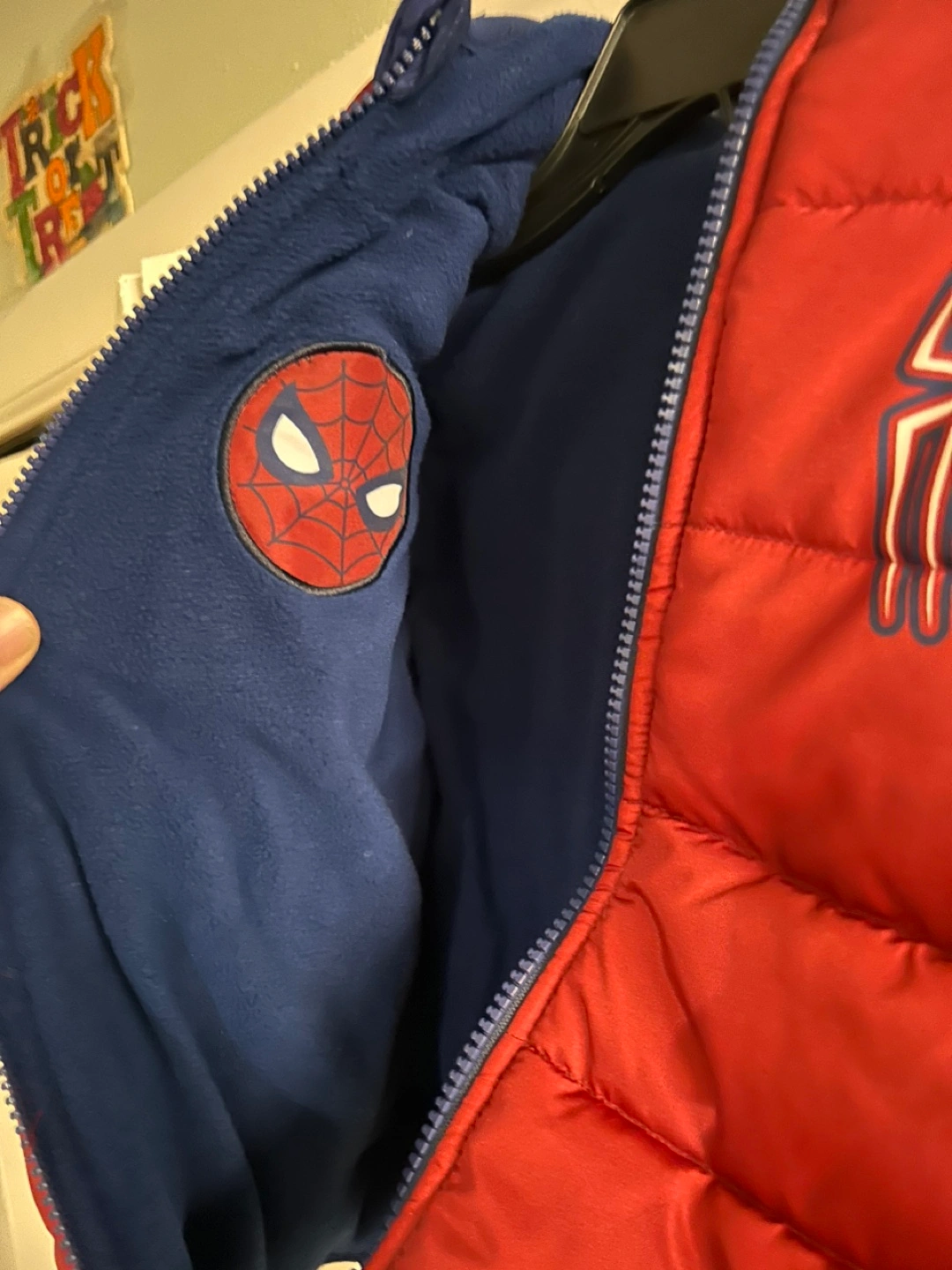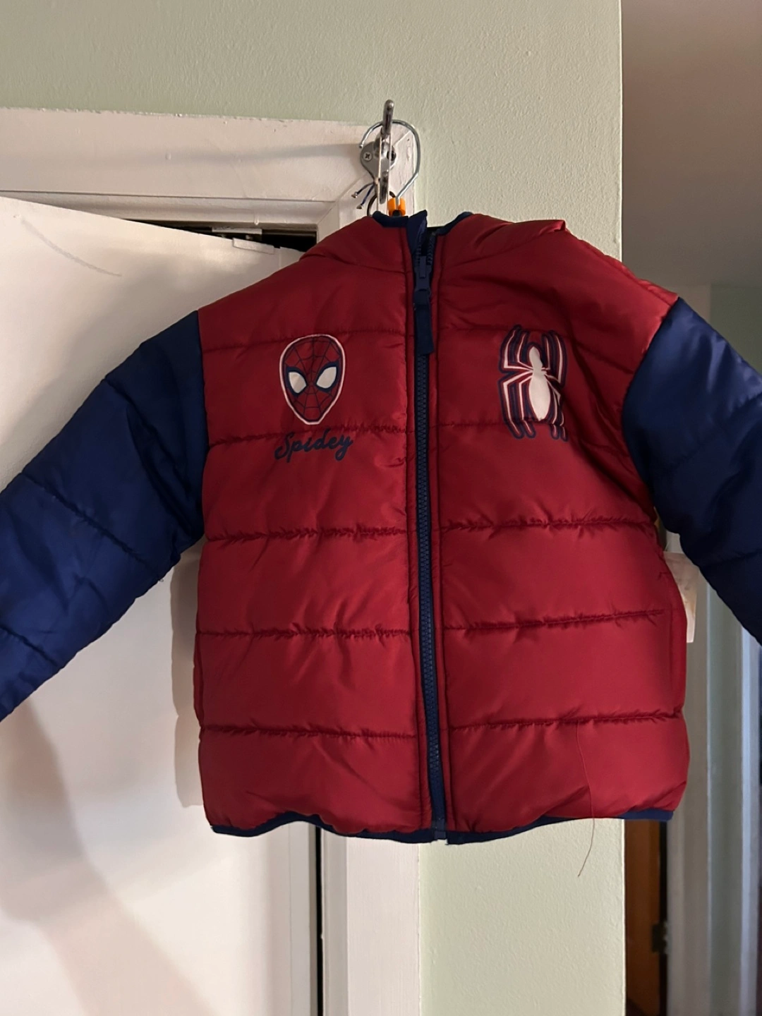 Red and blue puffer jacket. Features Spider-Man design on the front and back. Hood. Zipper closure. Size 4 .