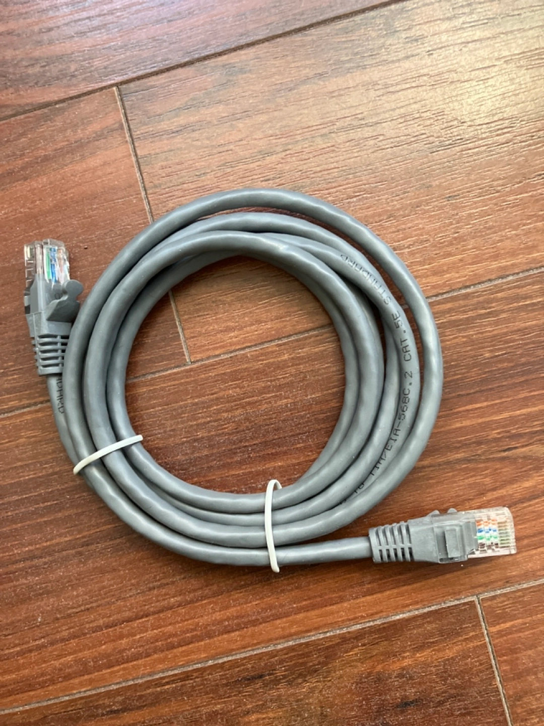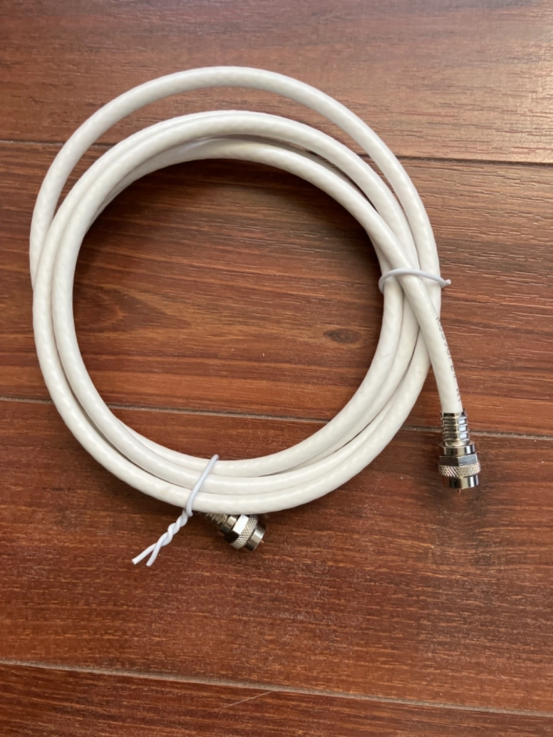 Coaxial cable and ethernet cables. Three cables in total. White cable has coaxial connectors. Yellow and grey cables have ethernet connectors.