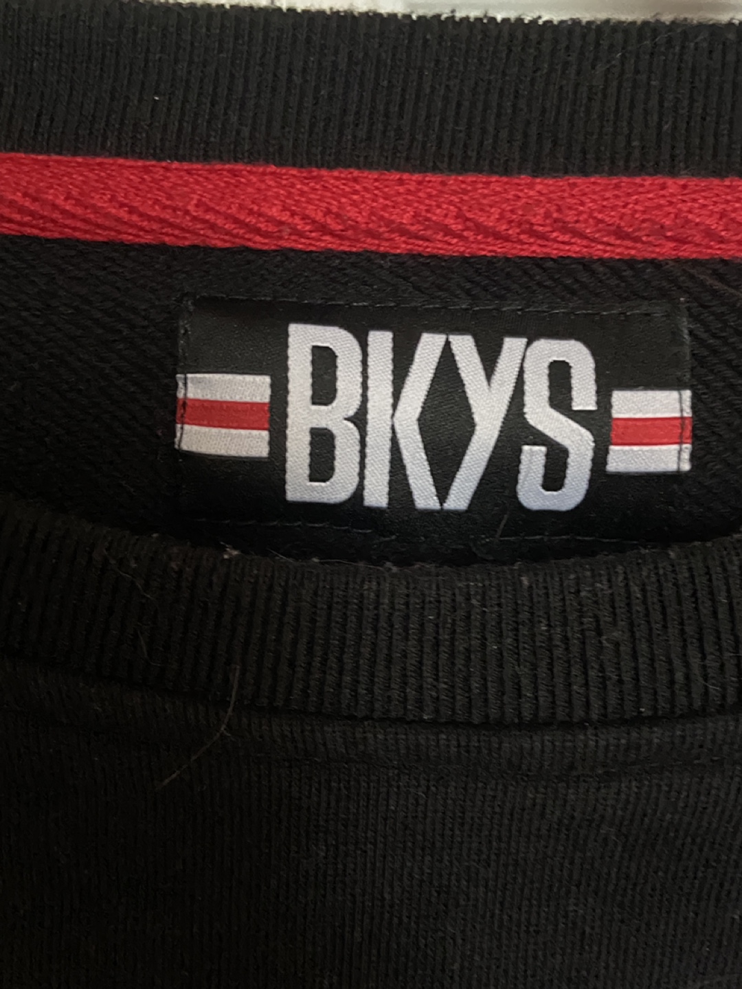 Black long-sleeved sweatshirt with a red embroidered design. Red and white striped detail on the collar.
