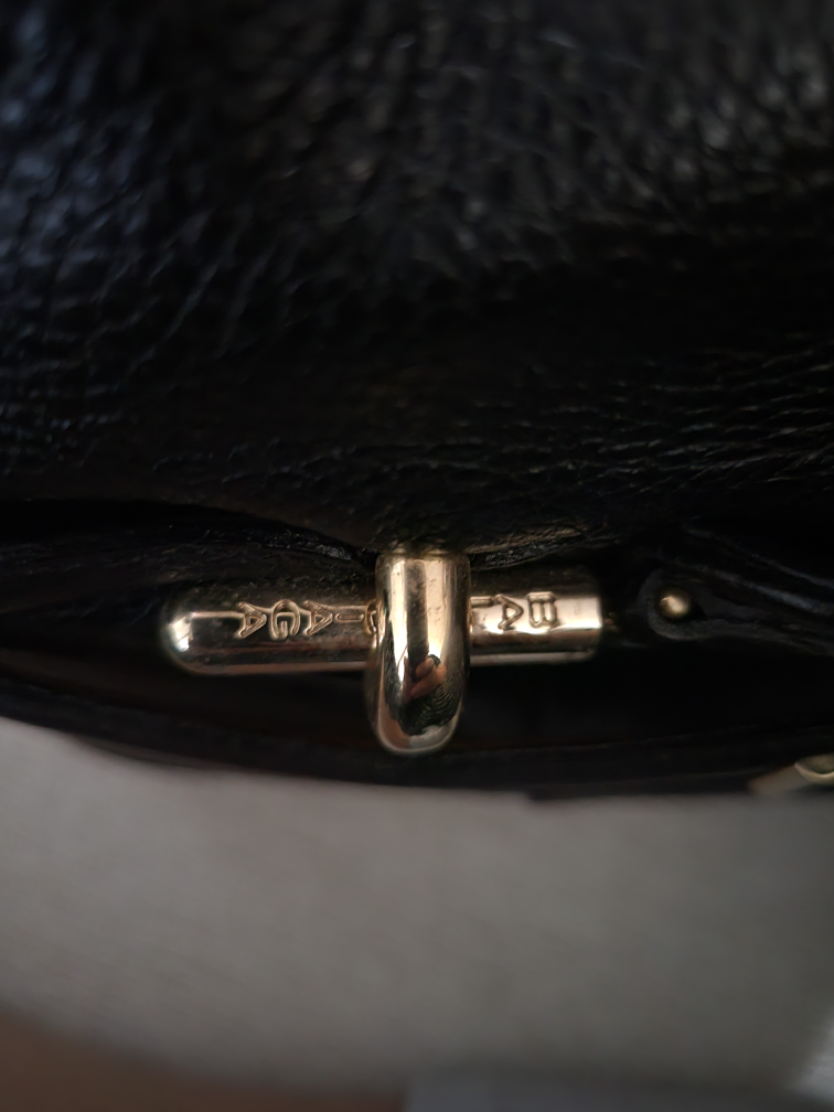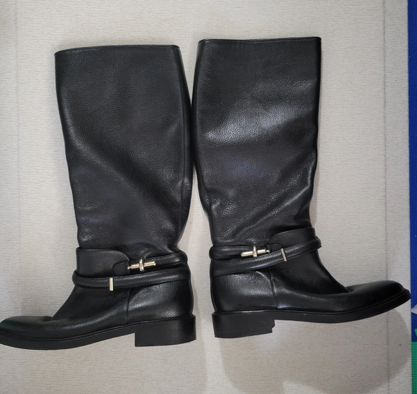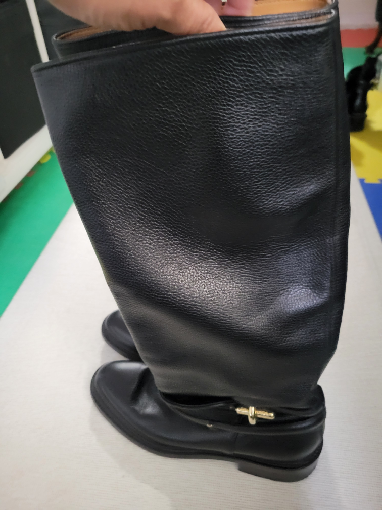 Black leather knee-high boots with gold hardware. The boots have a buckle strap and a low heel. Made in Italy.