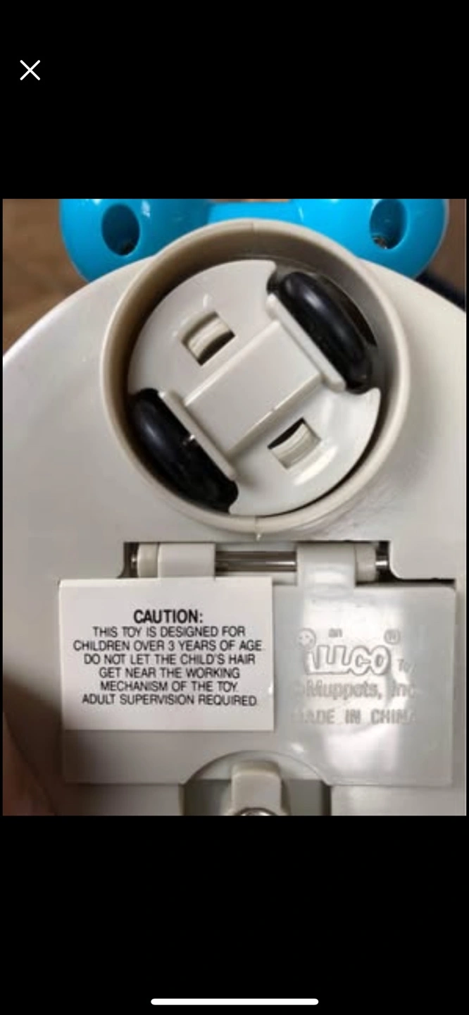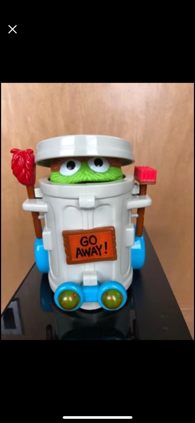 Heritage Bump and go Oscar the grouch, works well. Flashing lights, trash can noise and bump and go sensor. Mop and broom go up and down. No corrosion in battery compartment. Takes 2 C batteries (included) Ages 3 and up. Sells on Etsy for $53. No smoking or pet household. Pick up in Scenic Acres NW