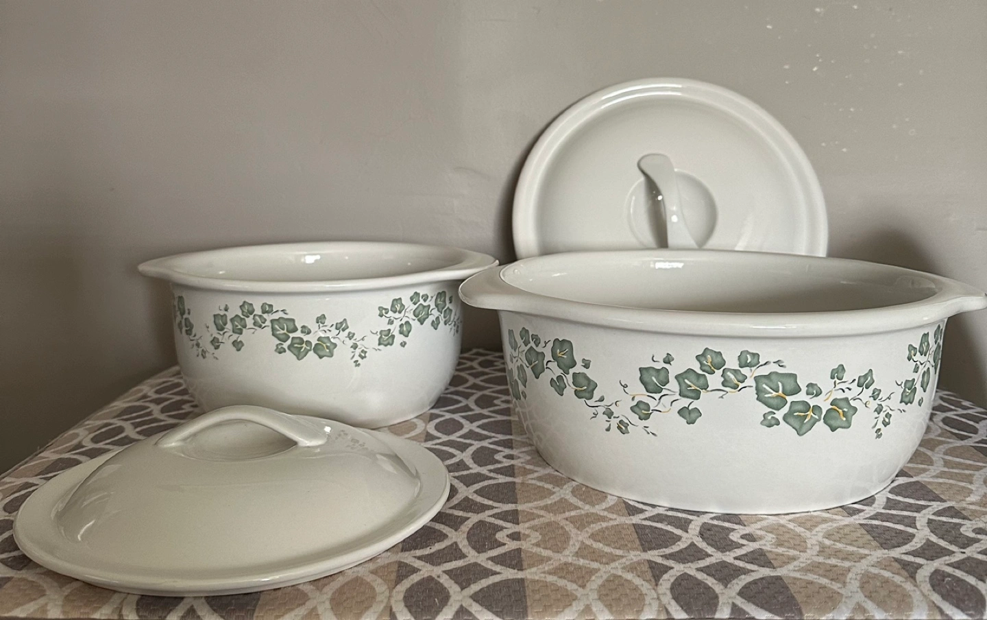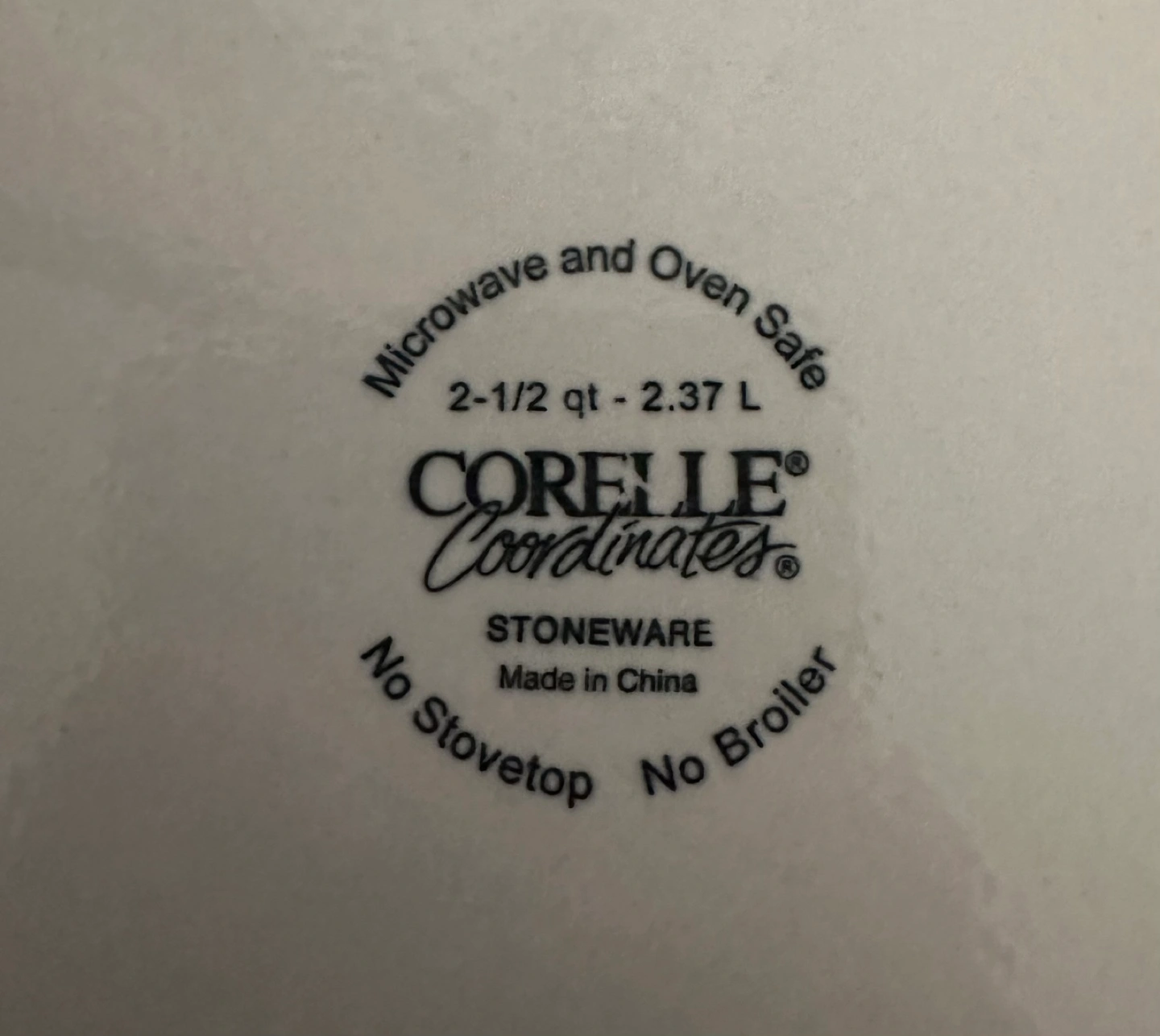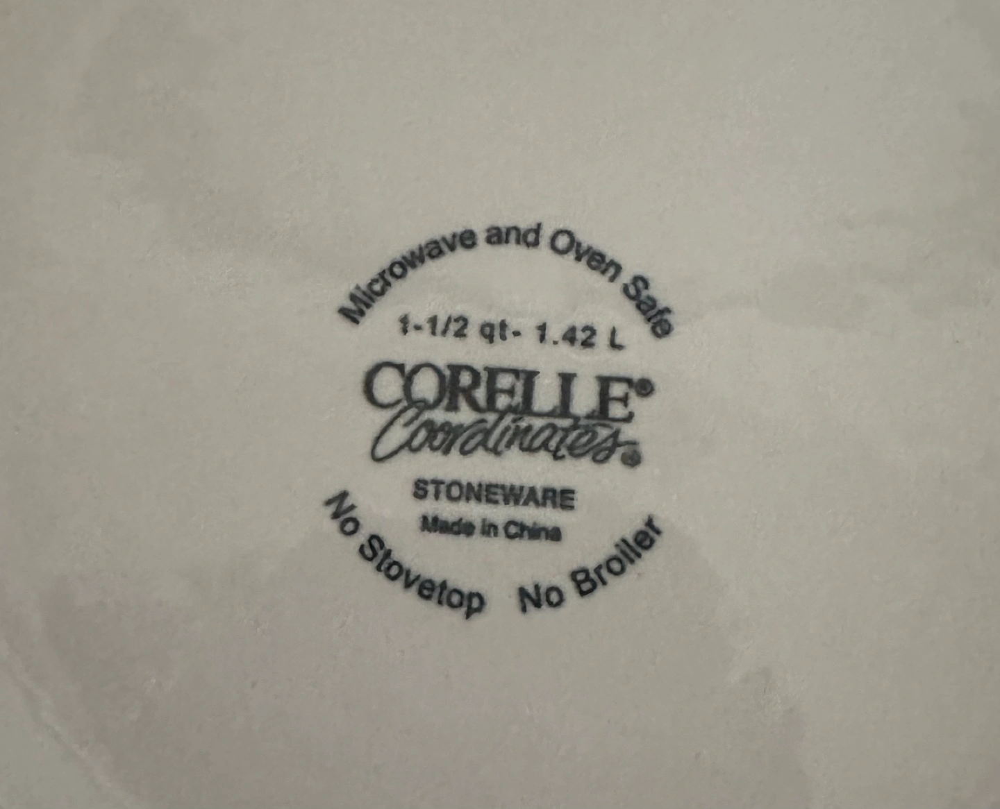 Set of two Corelle Coordinates stoneware baking dishes with lids. Both are microwave and oven safe. Smaller dish is 1 1/2 qt, larger dish is 2 1/2 qt. No stovetop or broiler use.