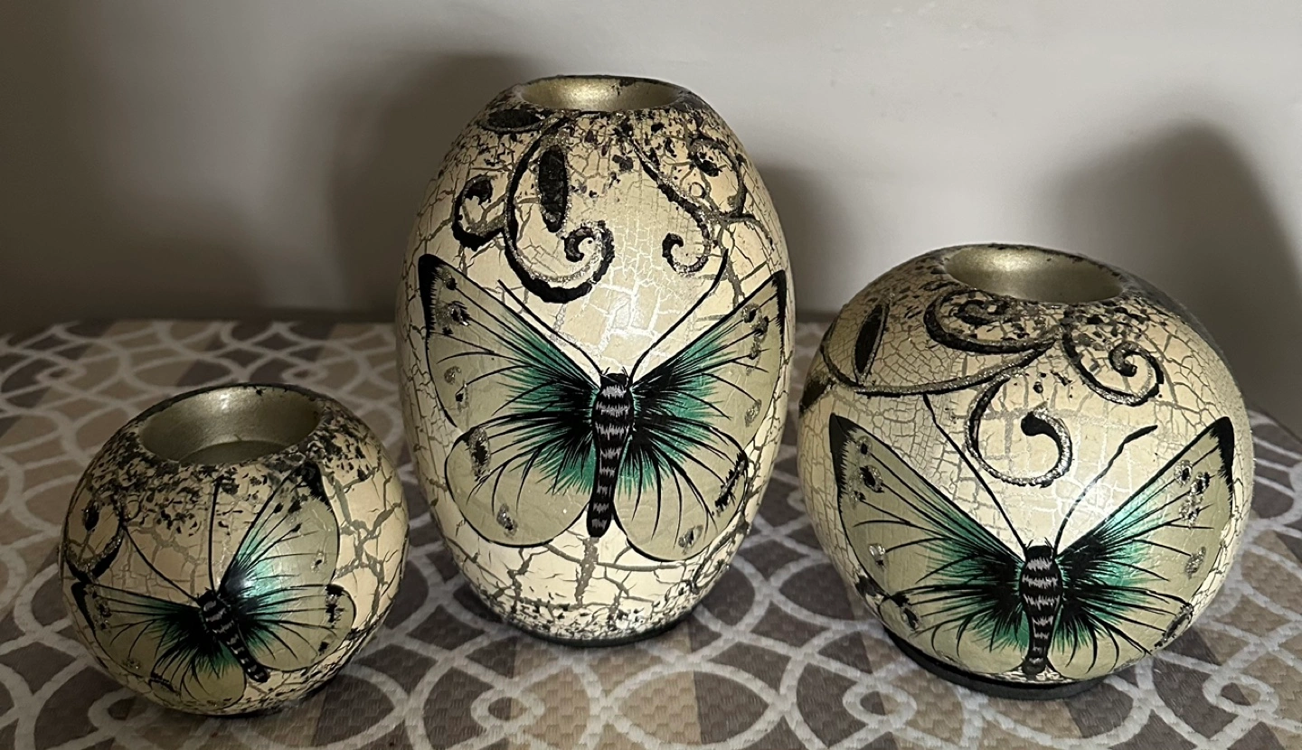 Set of 3 decorative candle holders with a butterfly design. Comes in 3 different sizes.