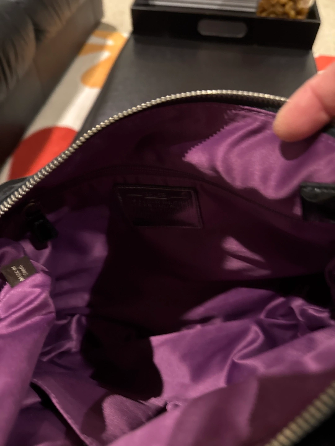 Black colour cross body bag with silver hardware. Has a zippered closure and a long strap. Has two small outside pockets. The inside has a purple lining.