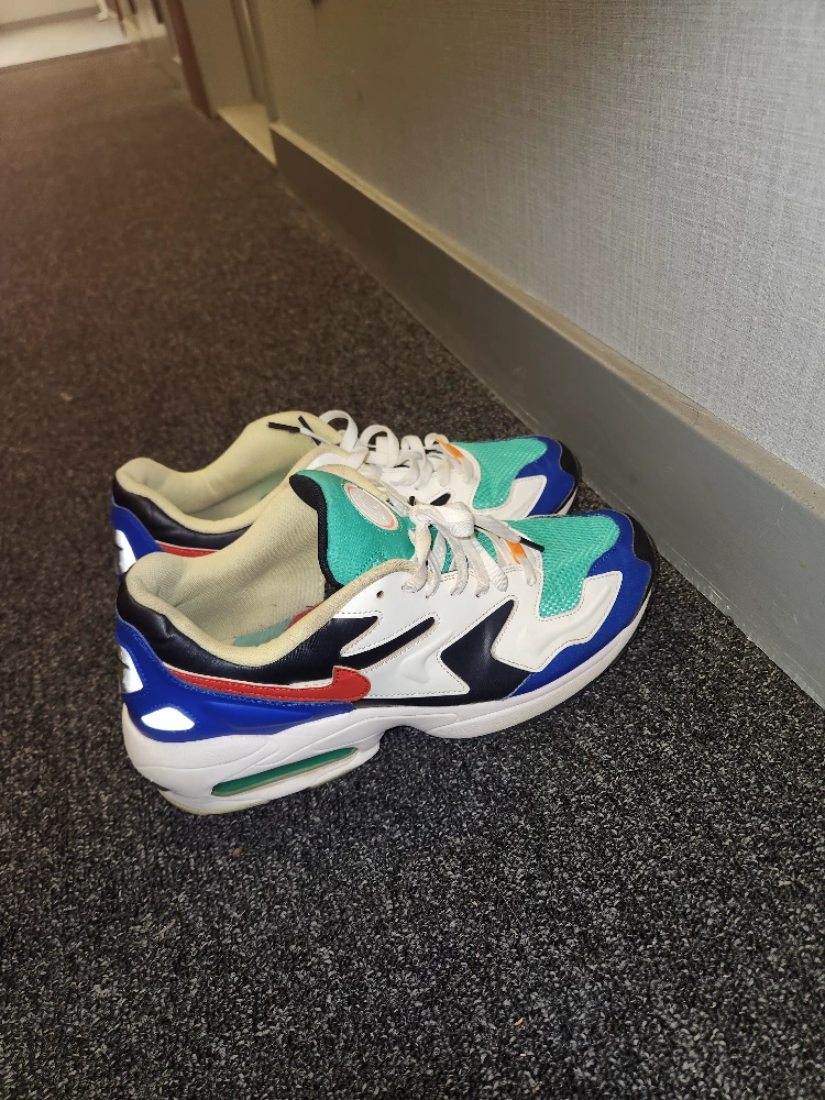 The The Nike Air Max 2 Light SP 'Sail Obsidian Blue' sneaker revisits the 90s classic, putting emphasis on the design lines with a color-blocked approach. The theme is played out with a palette of Obsidian, Sail, Racer Blue, teal, red, yellow and white—rendered in layers of mesh and leather to balance airflow and support. Max Air cushioning underfoot teams up with foam for a responsive feel below. This shoe was released in a pack of two AM Light 2s in May 2019.