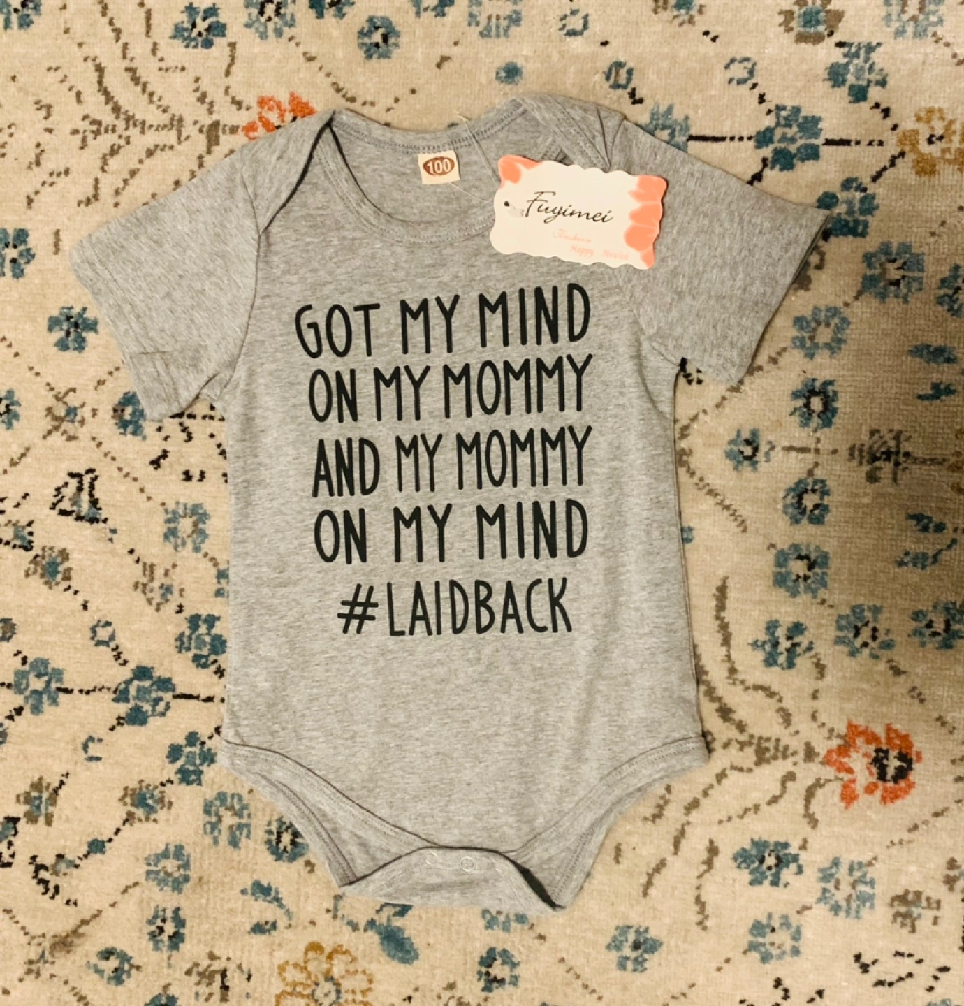 511Size 100 “Got my mind on my mommy and my mommy on my mind #laidback” grey shirt with black font. New, tags on.