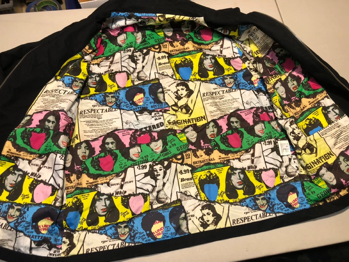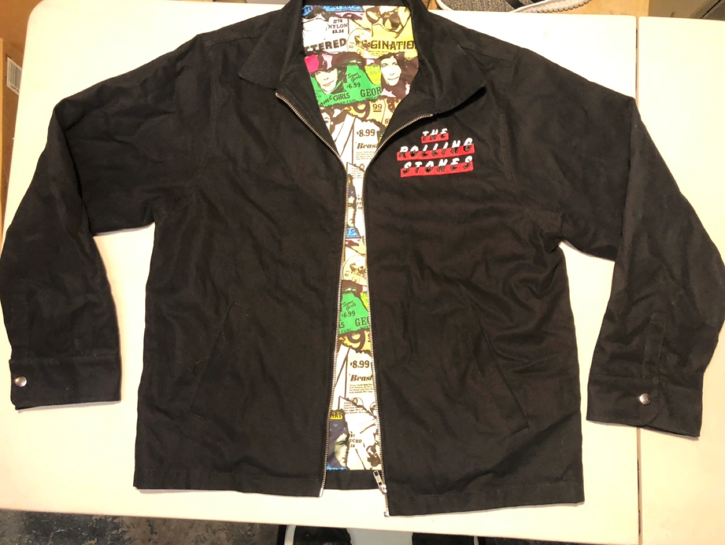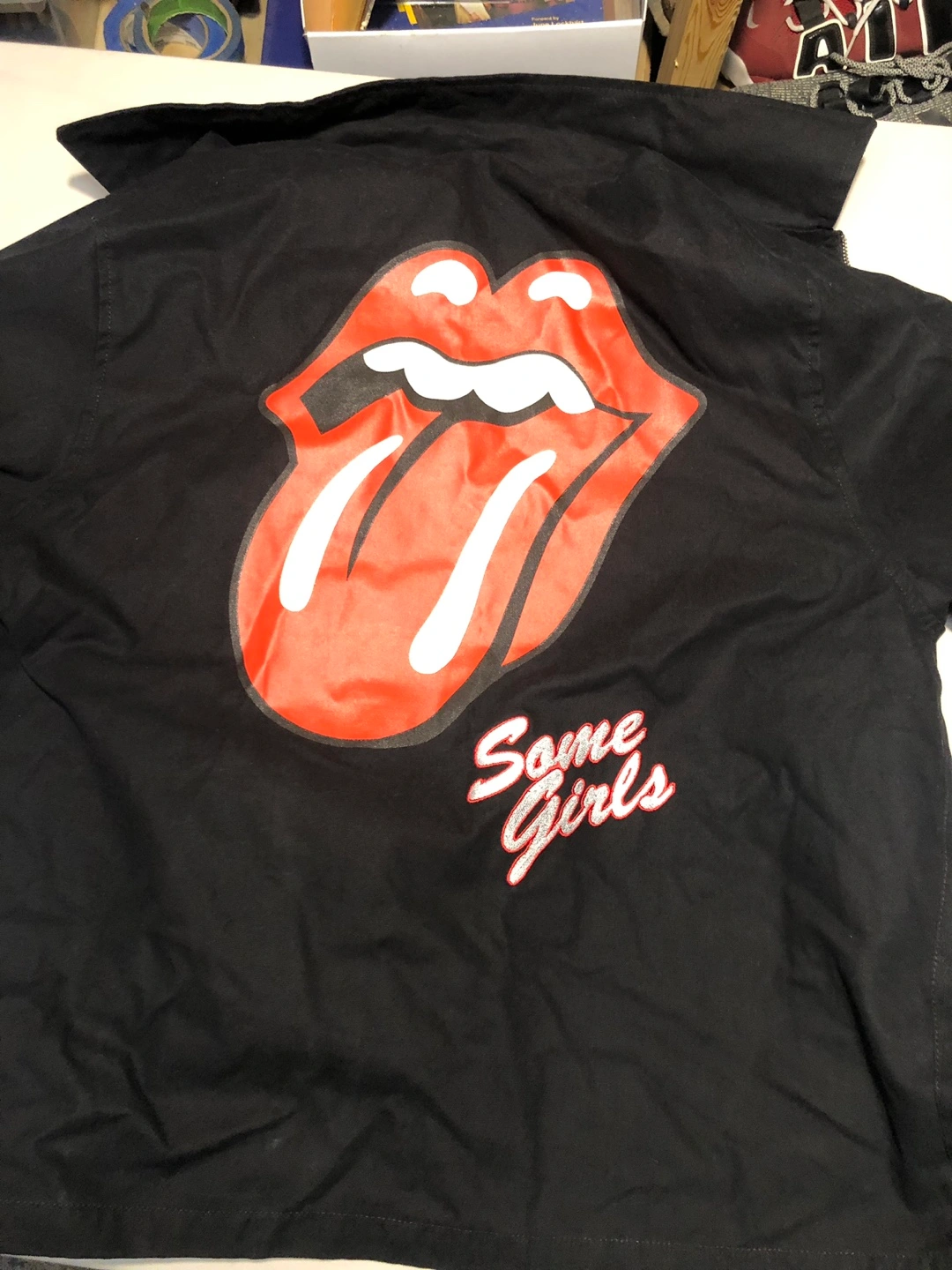 Black jacket with red and white 'The Rolling Stones' logo on the front and a red tongue with 'Some Girls' on the back. The inside lining has a pattern of various album covers.