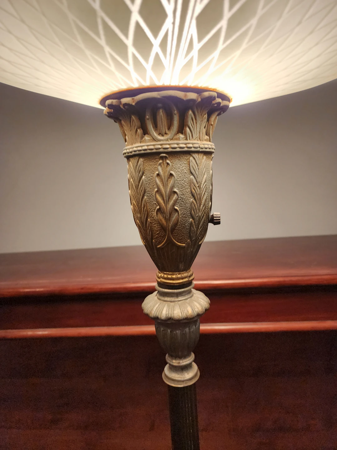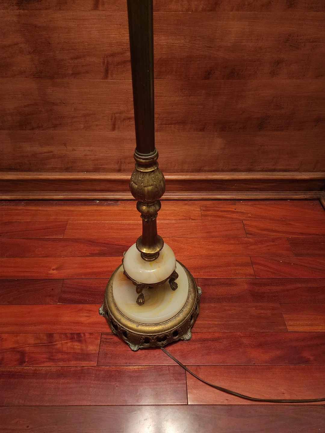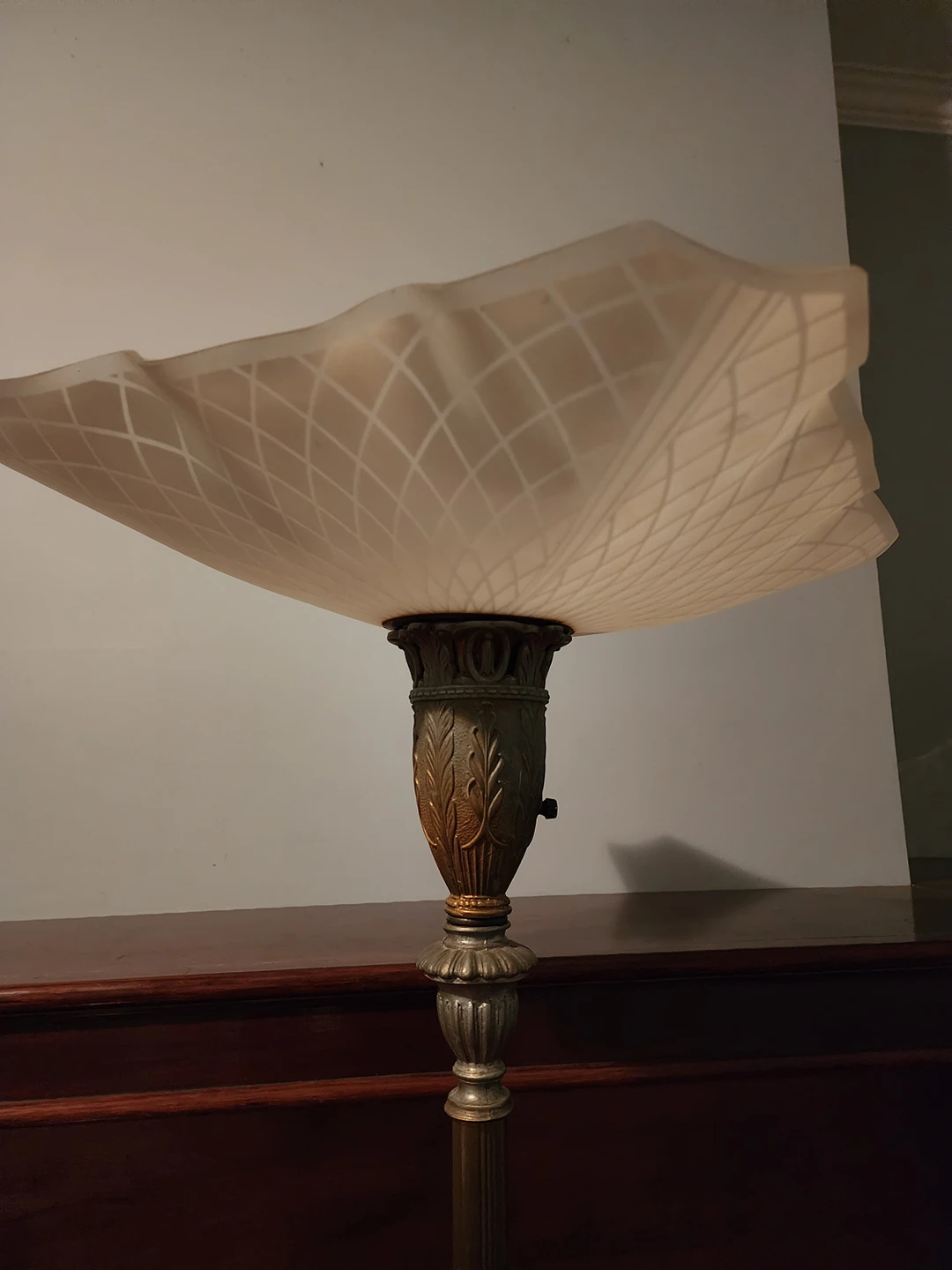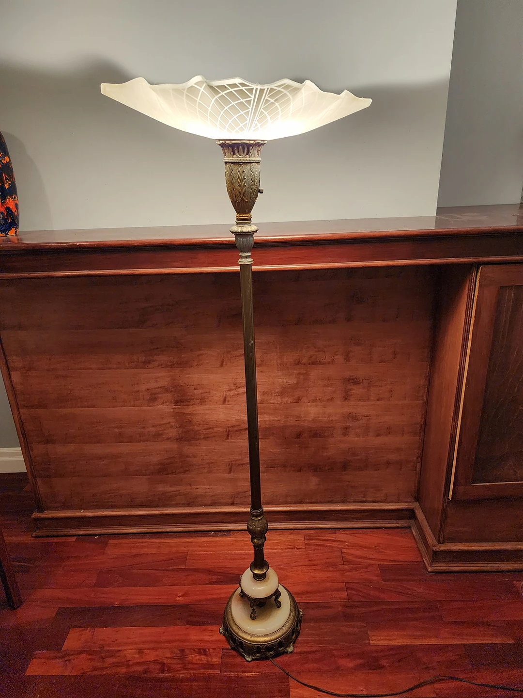 64" tall, glass shade is 17" across, base is 12" . in good working condition and cosmetically.