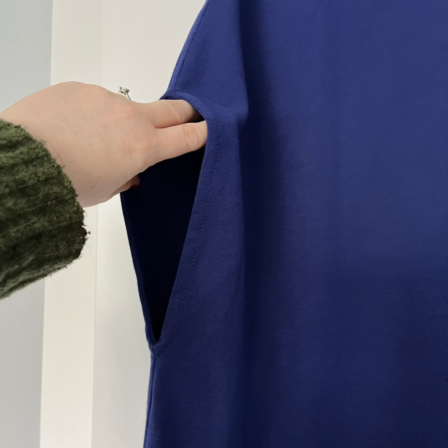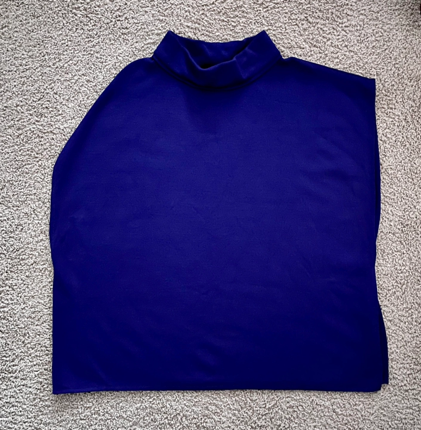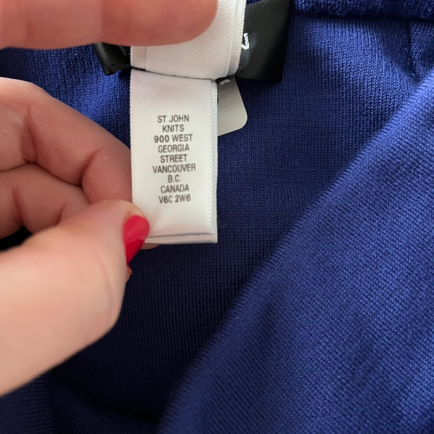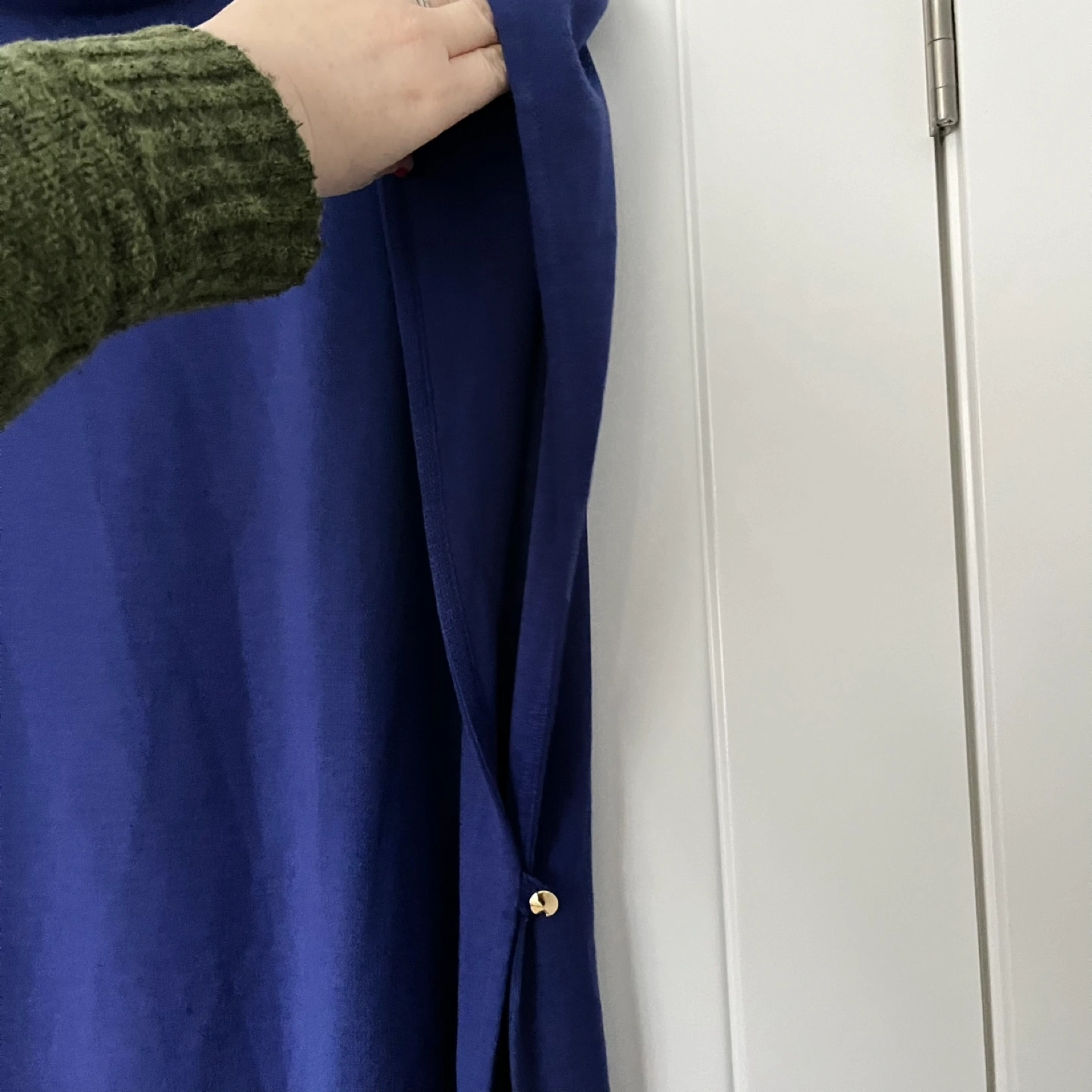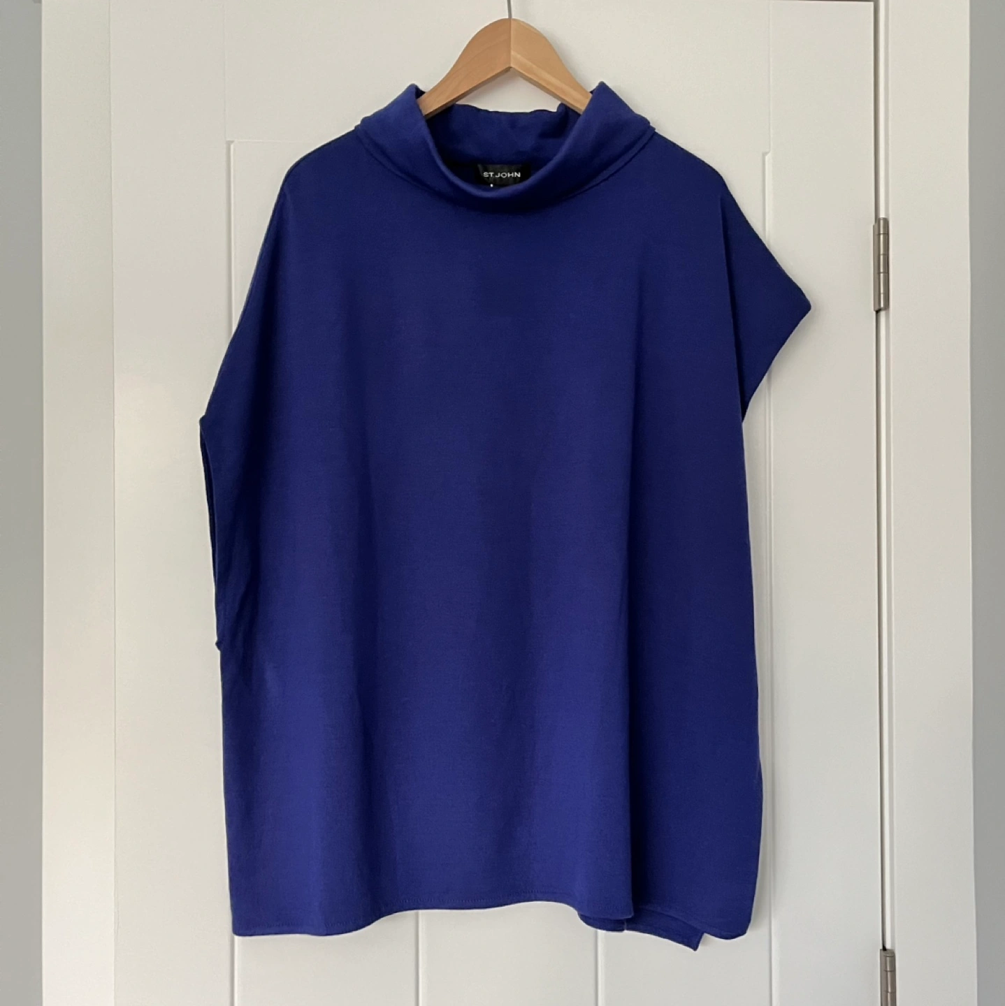 Luxurious asymmetrical knit wool blend coatigan with a large arm opening, the left side is open with a gold toned button closure. Unique and gorgeous piece with a mock neck by St. John, the designer brand synonymous with high quality. The colour is a beautiful rich purple/cobalt blue and is in excellent pre-loved condition. The model photo is included to illustrate fit only.