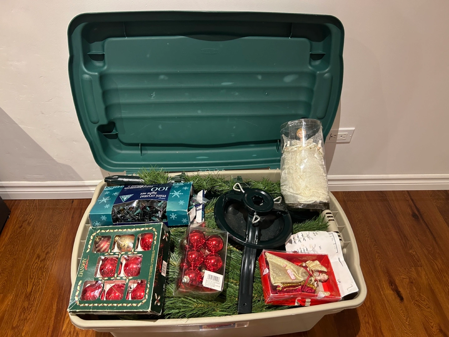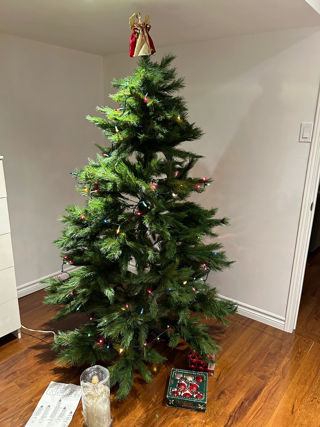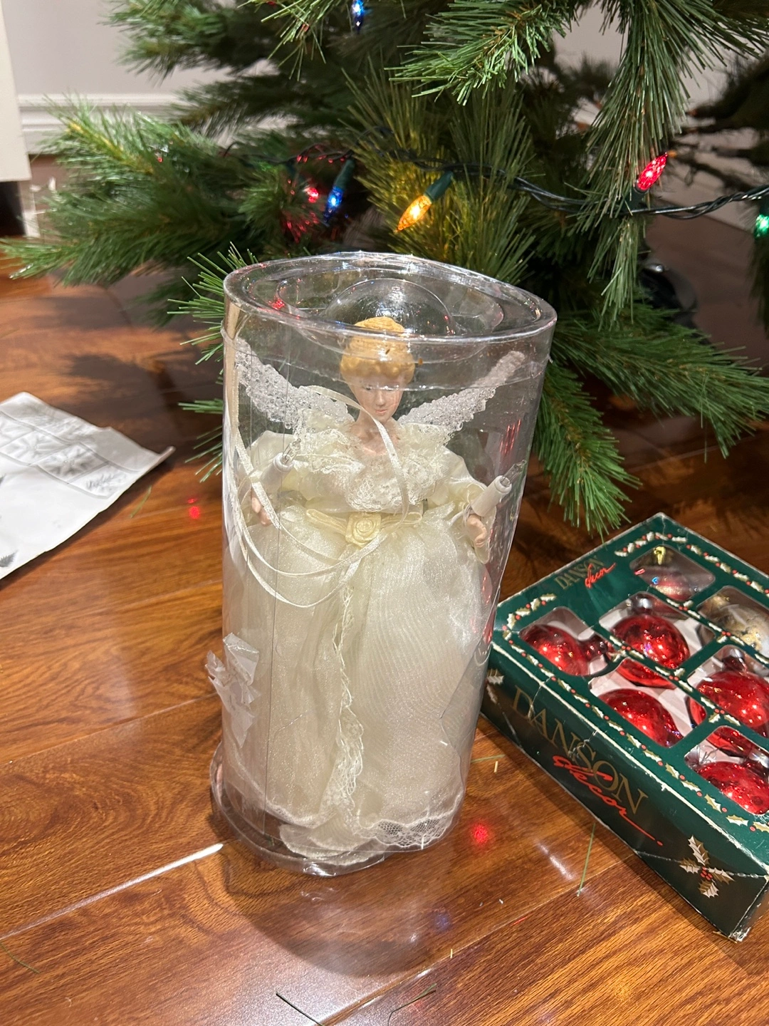Looks real artificial Christmas tree with lights, ornaments, and an angel topper. The tree is approximately 6.5 feet tall, box included, large white angel lights does not work.
