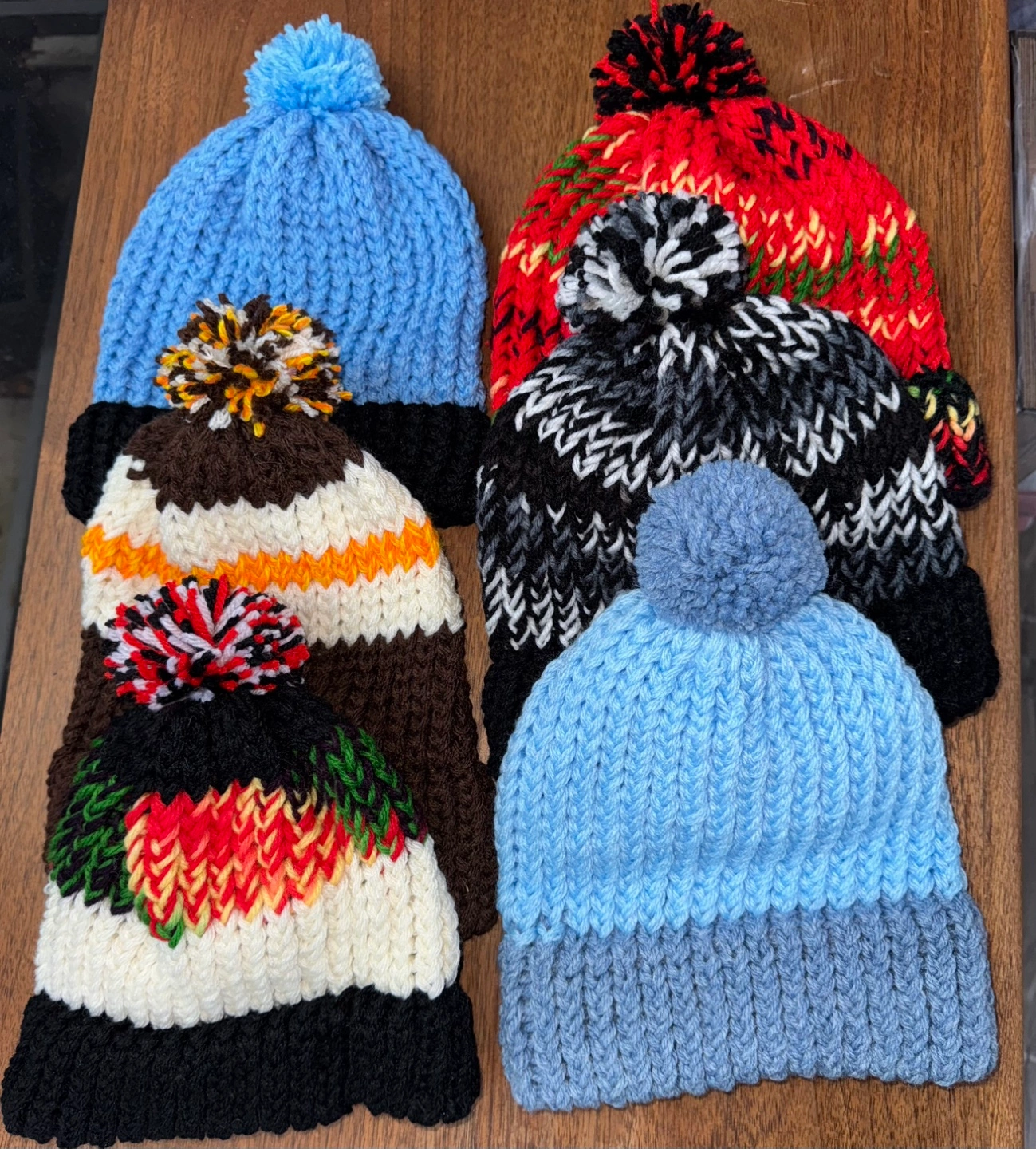 four knitted winter hats, in various colors and patterns. All hats have a pompom on top
