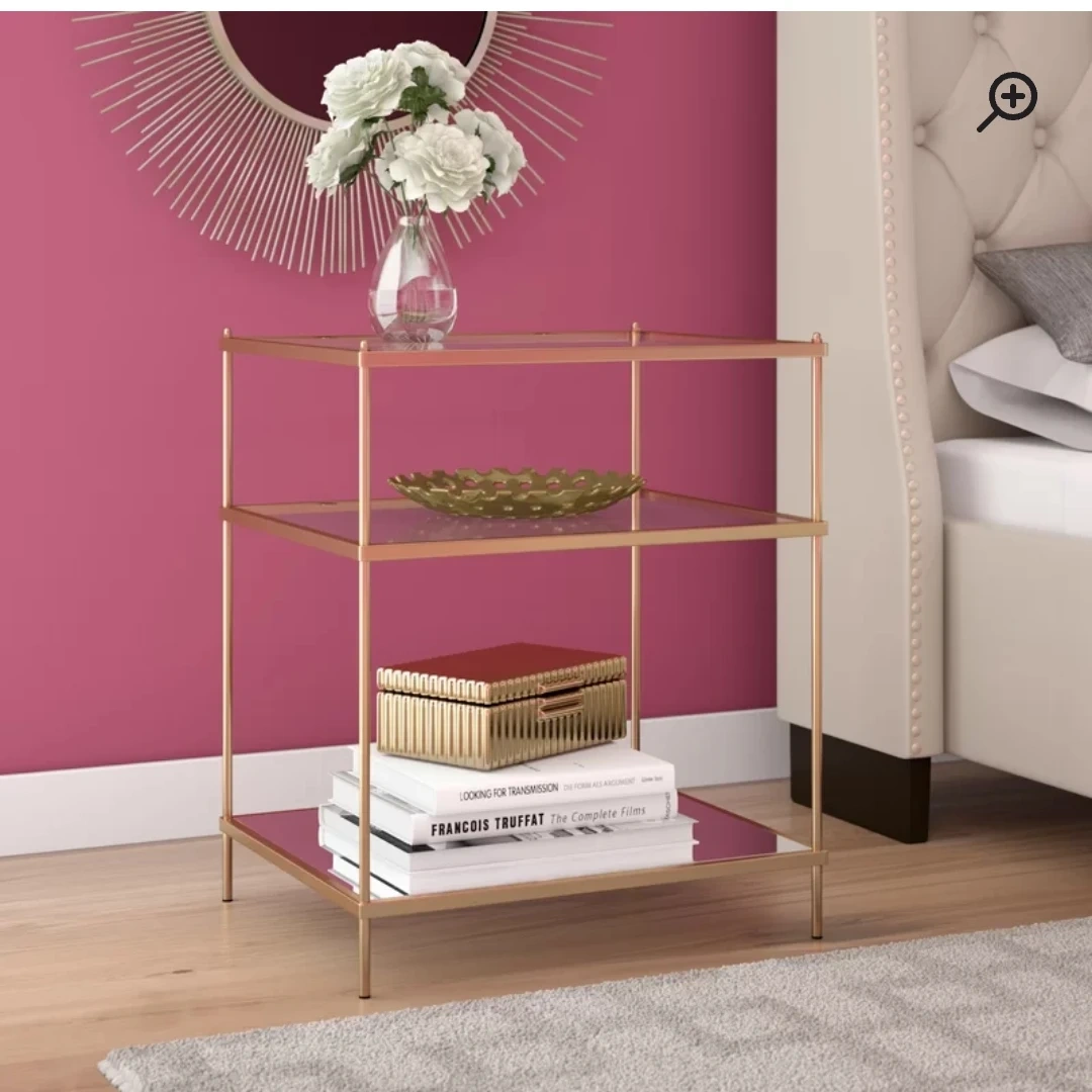 26.75'' H x 22'' W x 18'' D https://www.wayfair.ca/furniture/pdp/joss-main-peregrine-2675-tall-glass-end-table-c004190952.html Whether sidled up beside your sofa or acting as a nightstand in the master suite, this end table is always a stylish stage. Understated, but with a twist of glamour, it pairs a plated iron frame finished in gold or chrome with clear glass elements for a dash of elegance. Retail: 240 +tax By Joss & Main