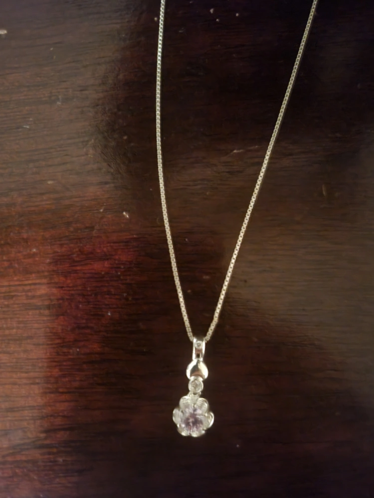 Silver chain necklace with a crystal flower pendant.