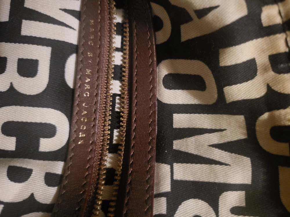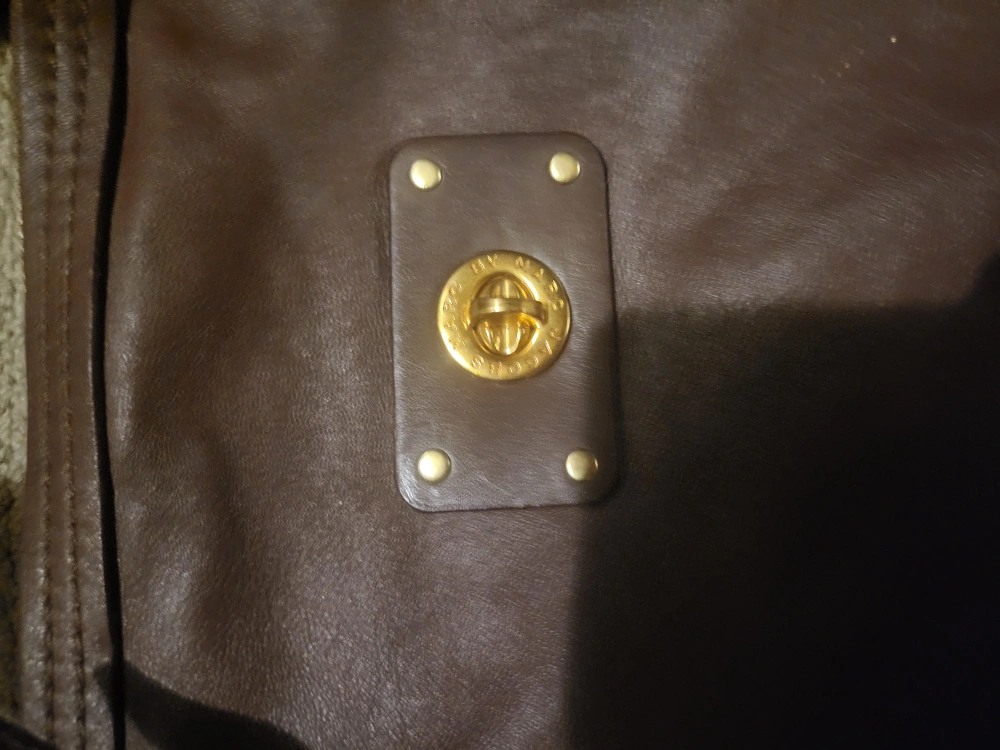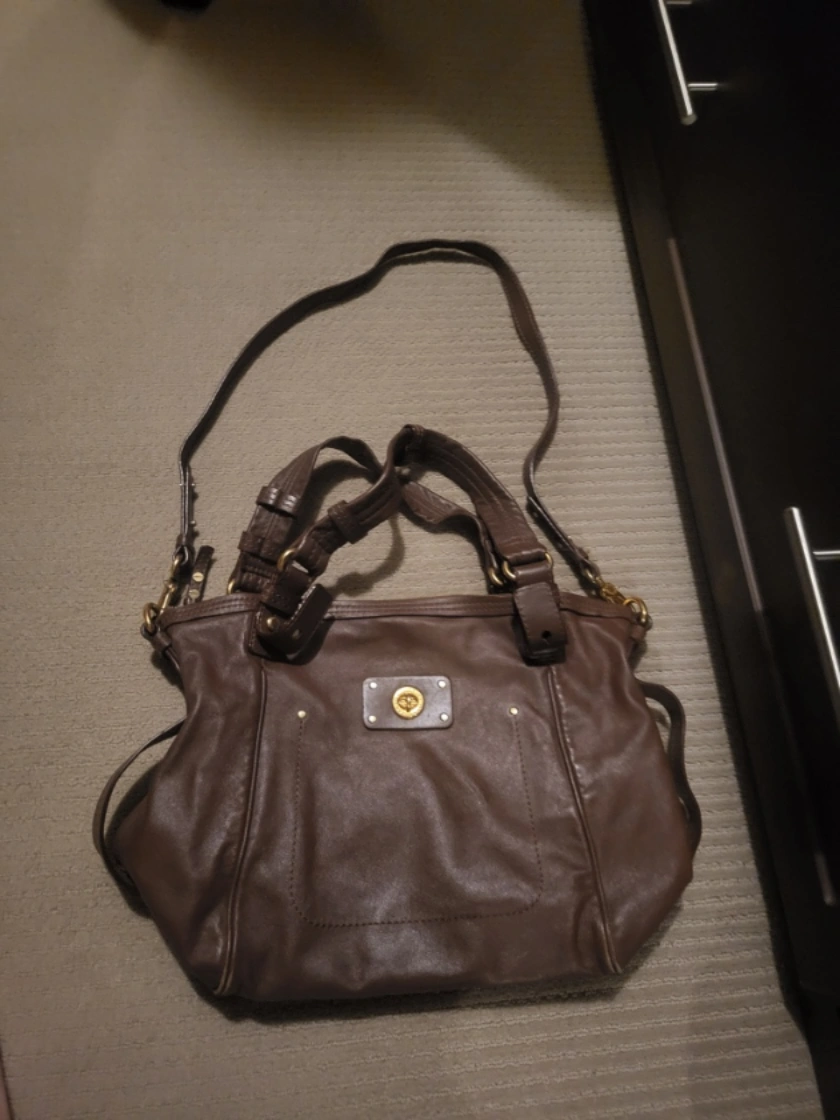 Brown leather shoulder bag with gold hardware. Has a long shoulder strap. Inside lining has the Marc Jacobs logo repeated.