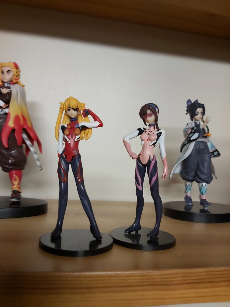 81Two anime figures, one with red and one with purple detail. Each figure comes on a circular base.