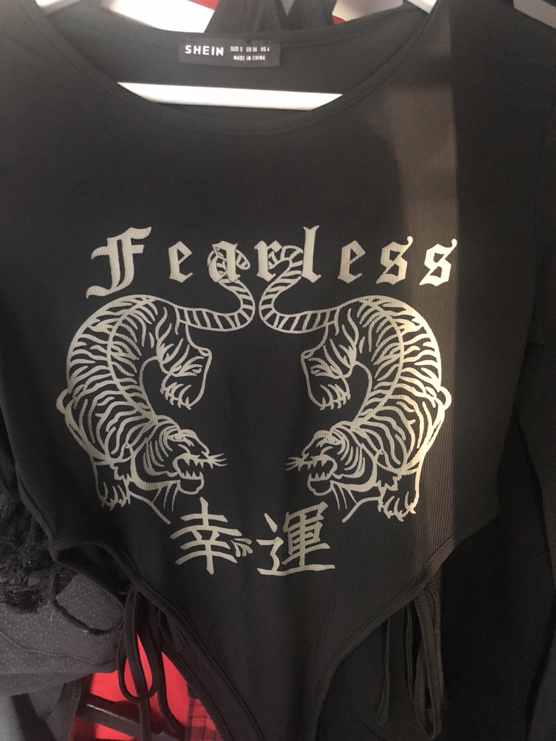 Black ribbed bodysuit with a tiger graphic and 'Fearless' text. Super high cut on legs with tie strings at the waist.