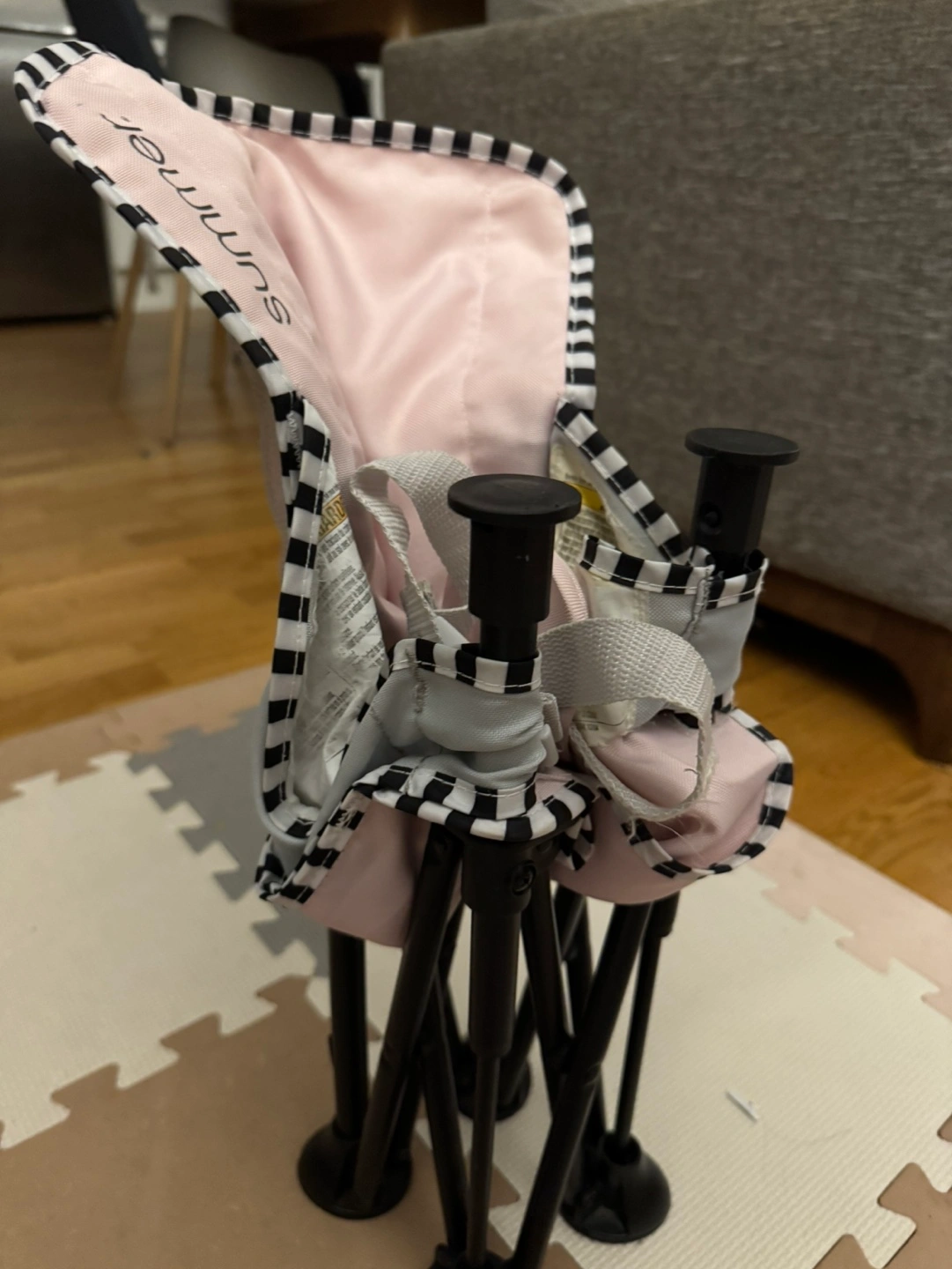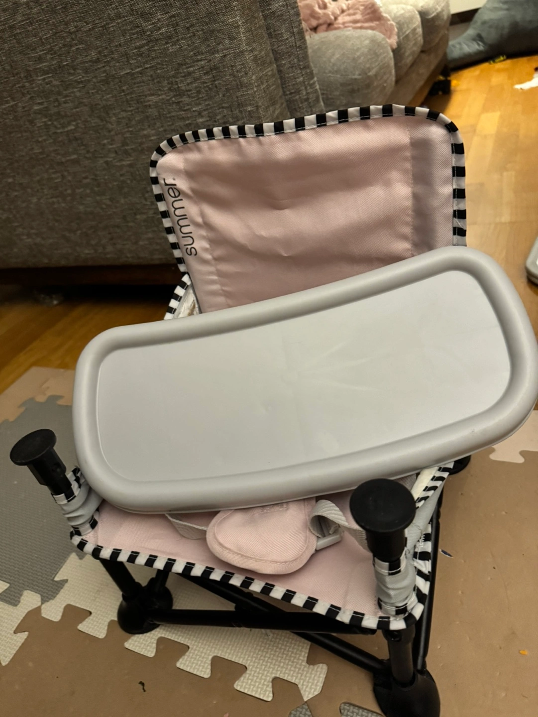 Black and white checkered fabric, pink padded seat. Includes a removable tray. Folds up for easy storage.