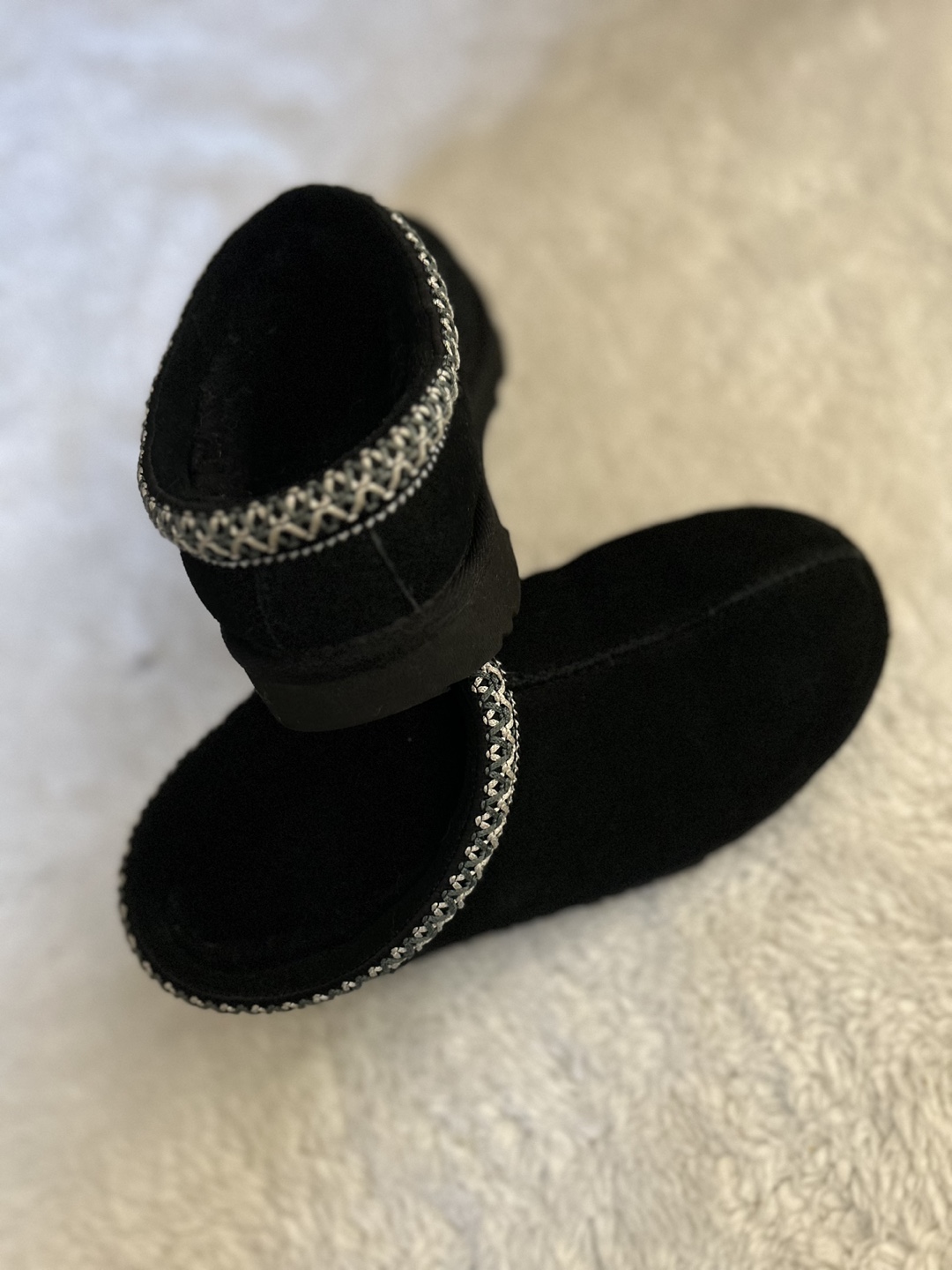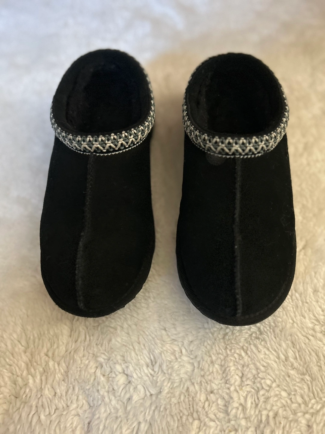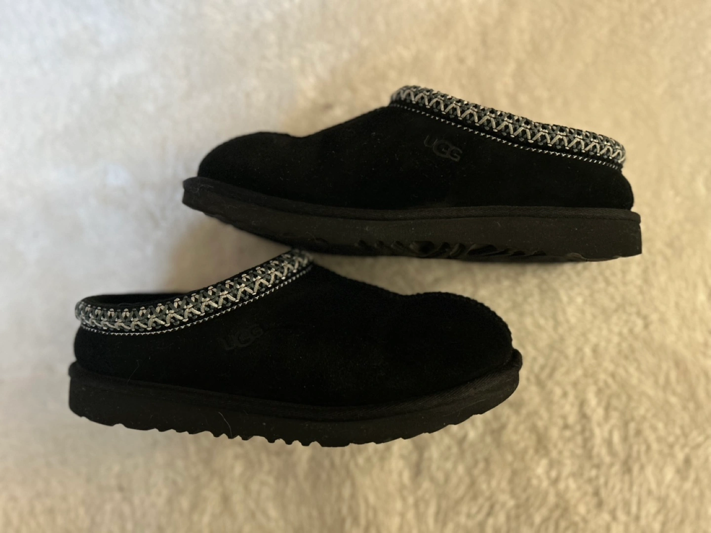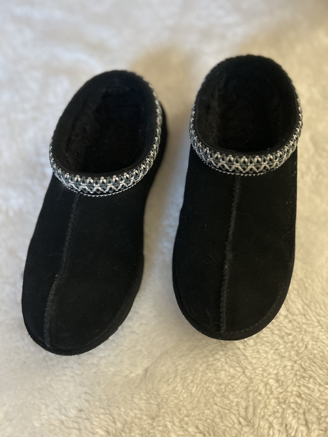 UGG Black suede slippers with a grey and white Tasman braid on the upper.