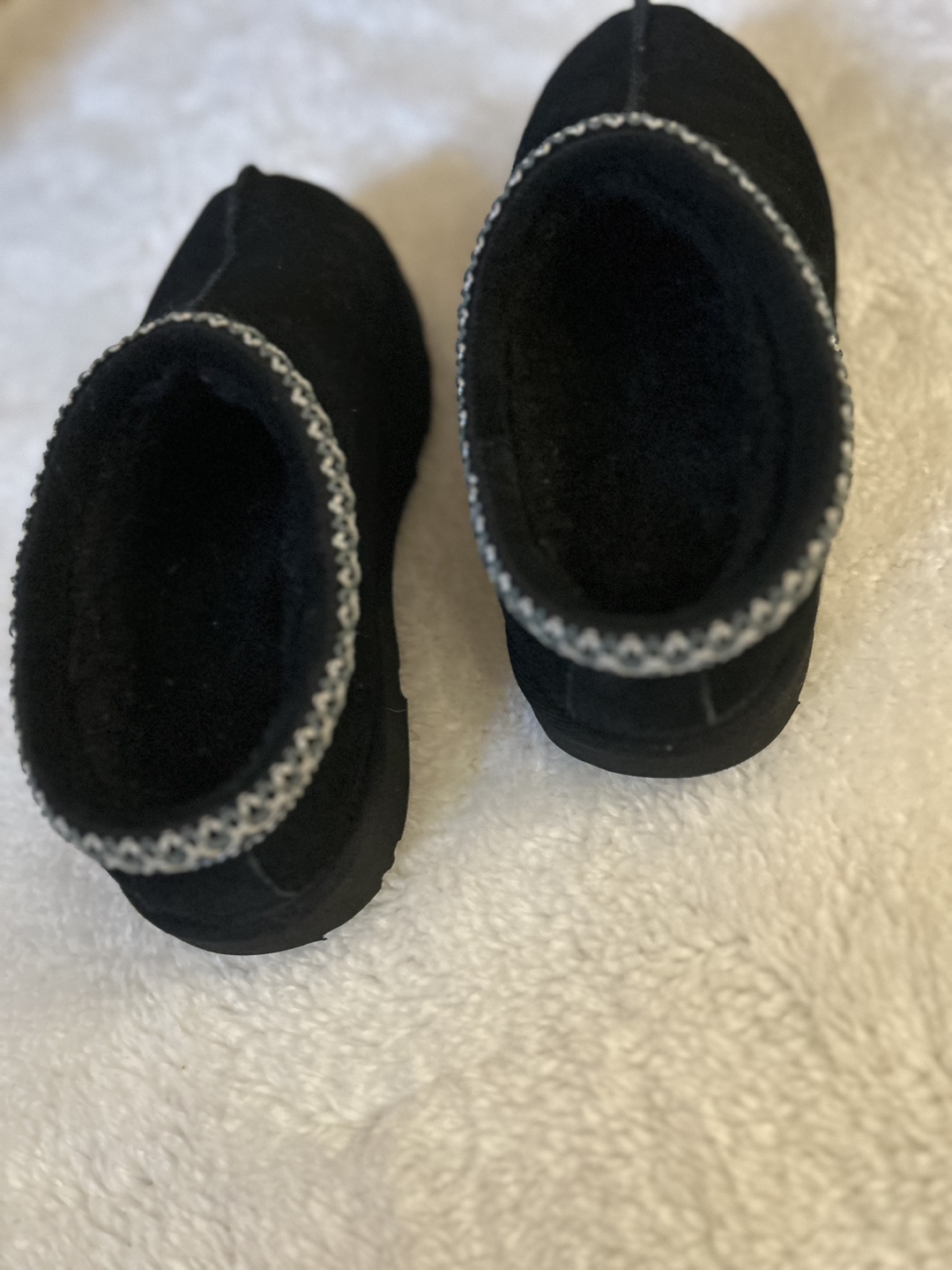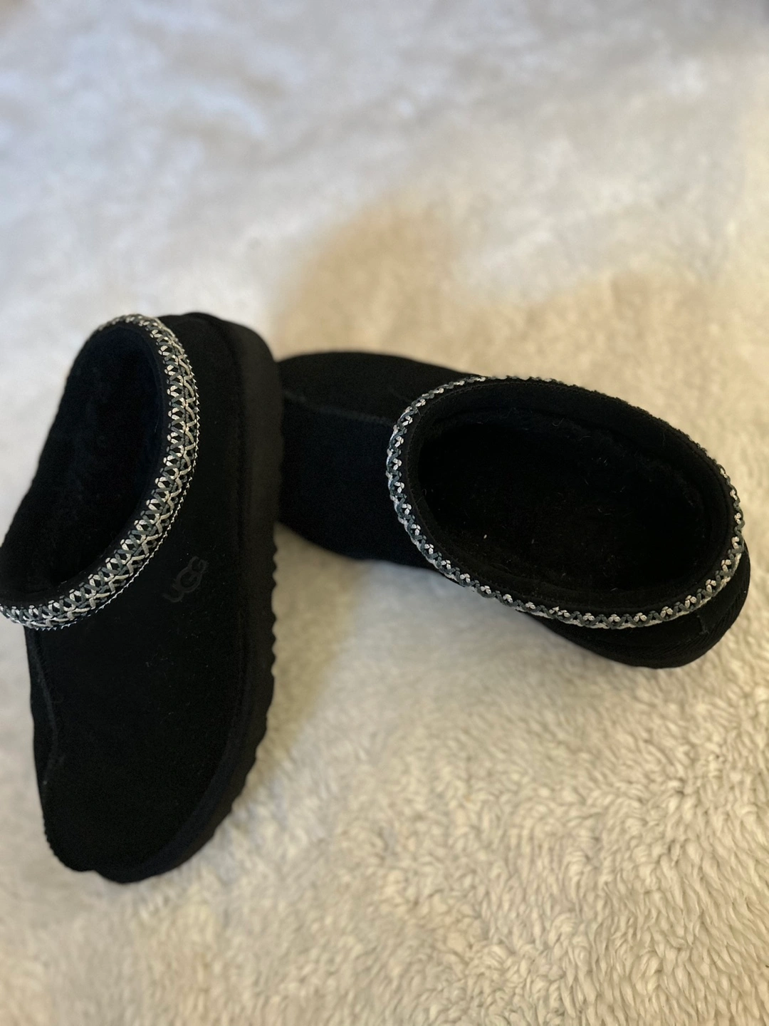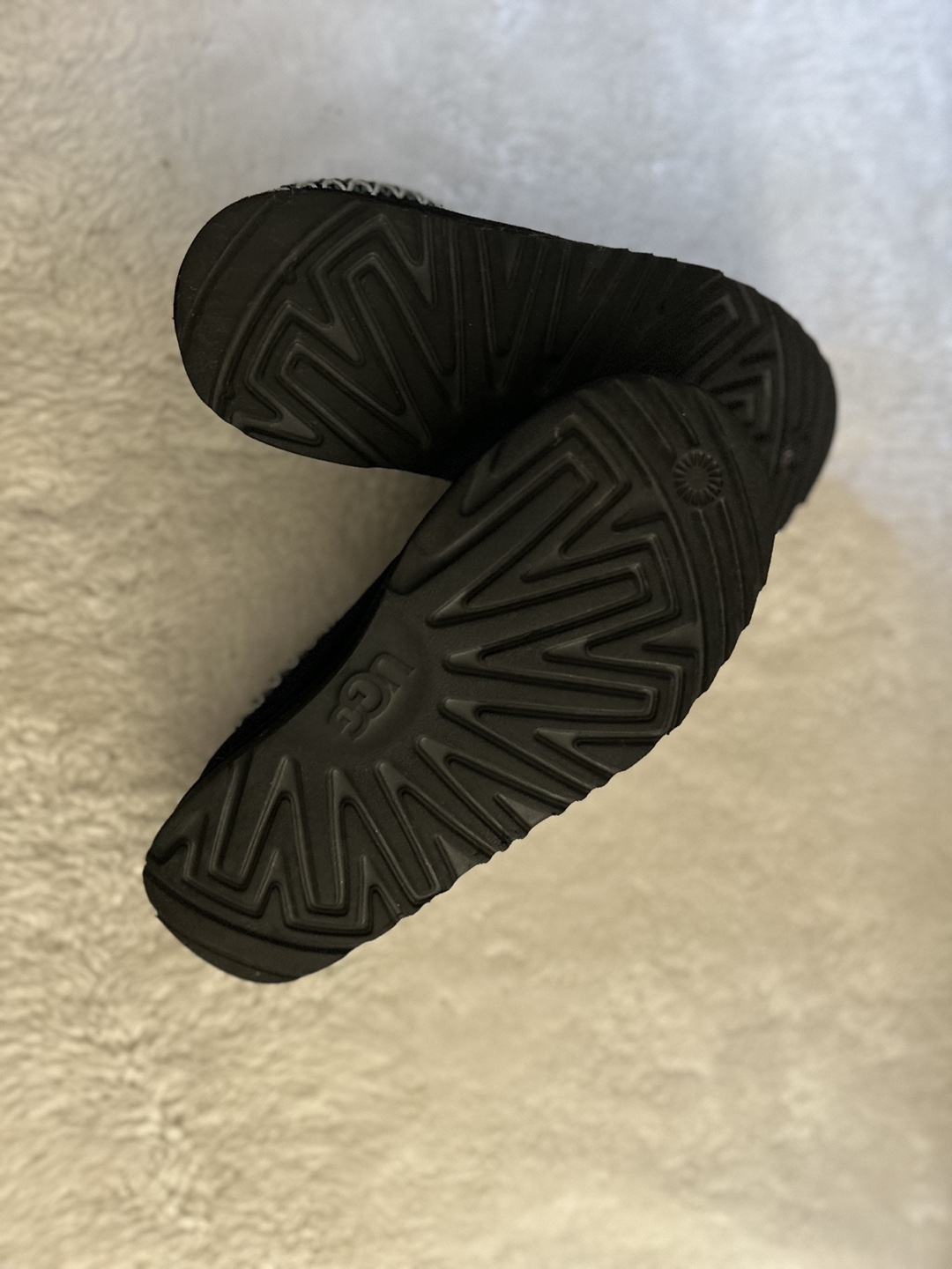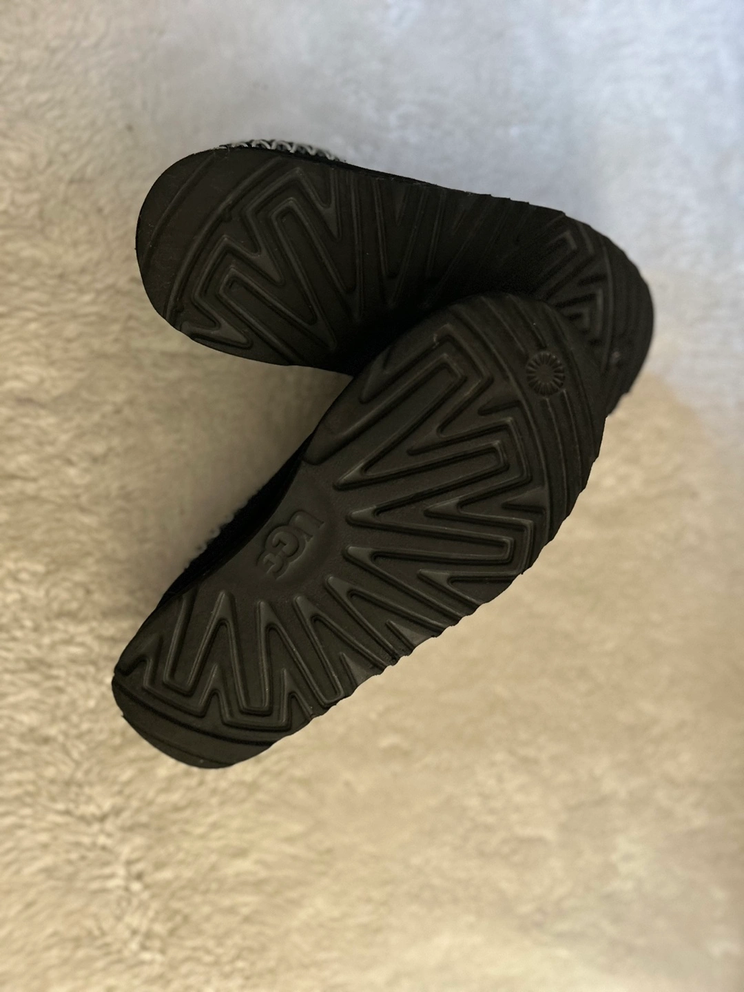 UGG Black suede slippers with a grey and white Tasman braid on the upper.