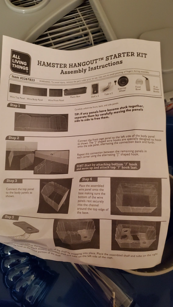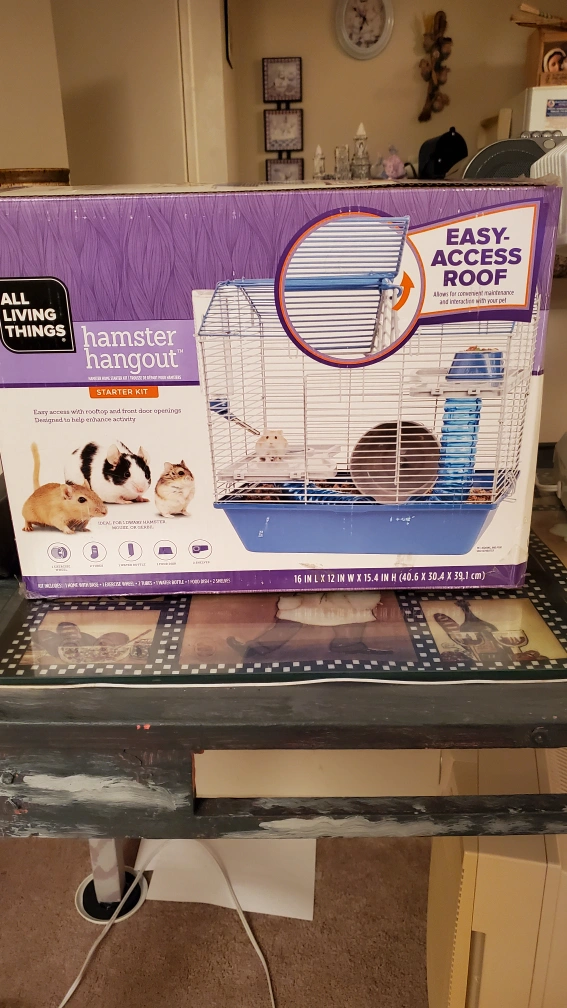 Hamster cage with accessories, including two tubes, a wheel, a water bottle, and a food dish. The cage is 16 inches long, 12 inches wide, and 15 inches high.