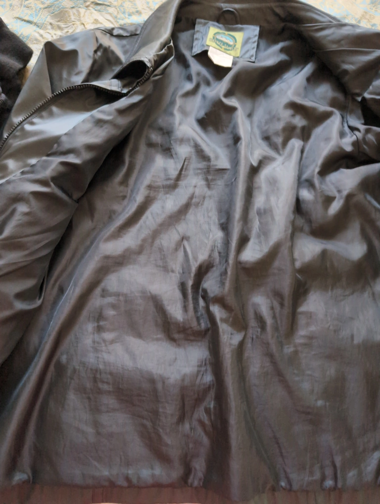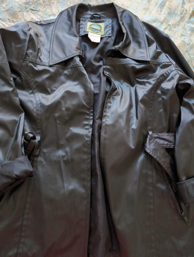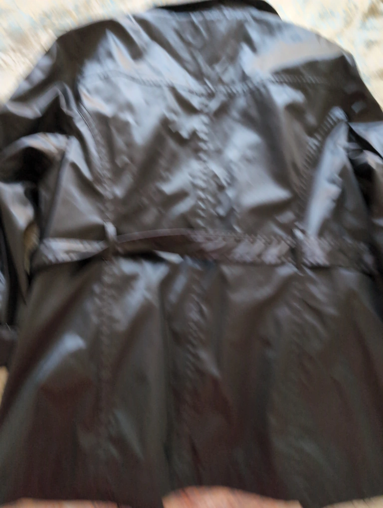 Black faux leather rain jacket with a belt. Zipper, pockets and button closure. Lined.