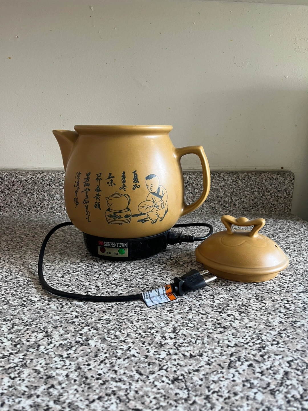 Electric teapot with a clay pot and a base. Comes with a lid. The teapot has a cord and a plug. The base has two lights, one red and one green. Pick up only Cash only. Bring own bag please First come first serve