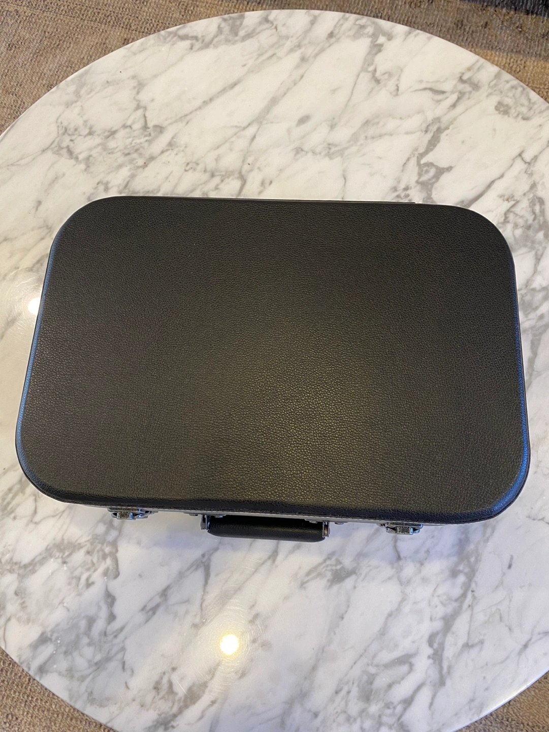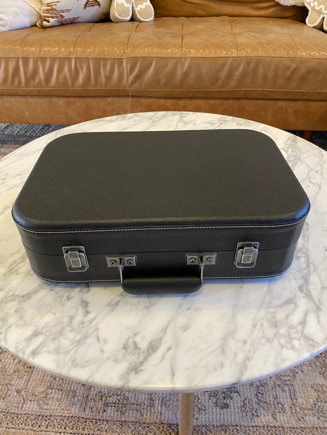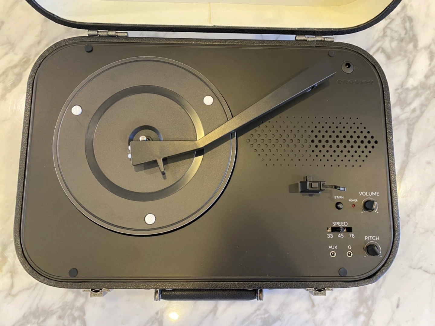 Brand new. Black portable record player in suitcase design. Plays 33, 45, and 78 RPM records. Includes built-in speakers and headphone jack.
