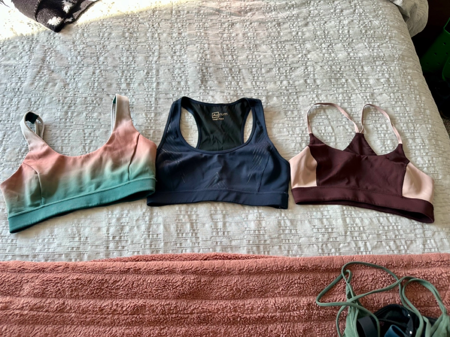Three sports bras, one navy blue, one burgundy with pink details, and one ombre green and pink. All have a racerback style.