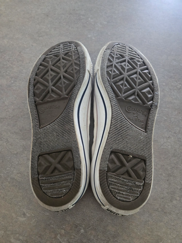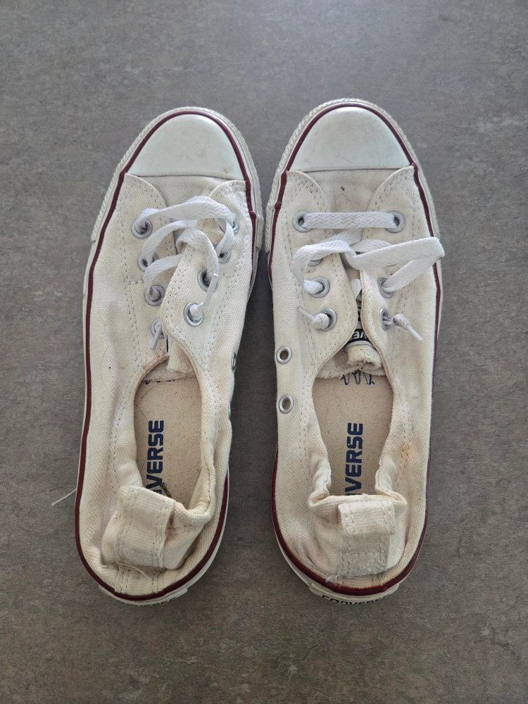 White canvas slip-on Converse All Star sneakers. Classic design with a comfortable fit. Good condition but stained.