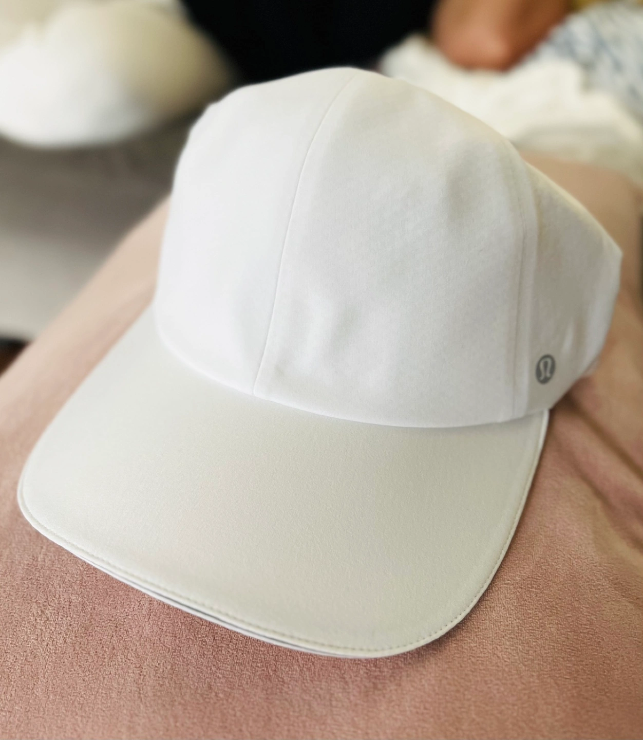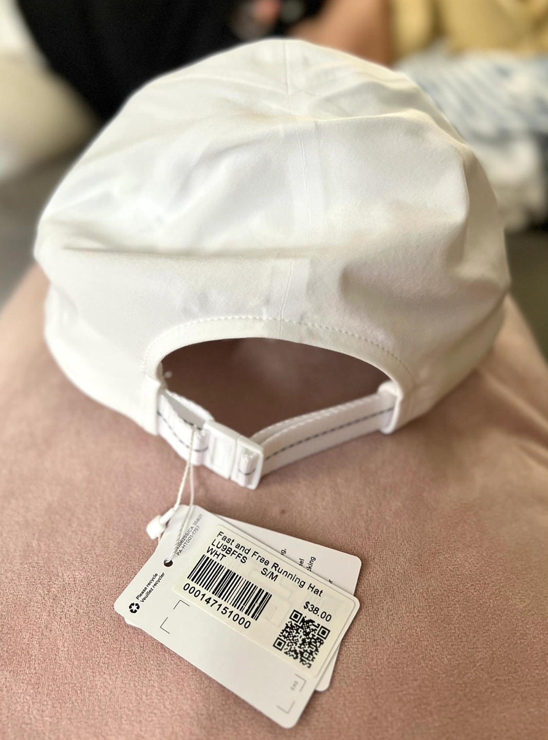 White running hat with a wide brim, adjustable strap and Lululemon logo. New with tags.