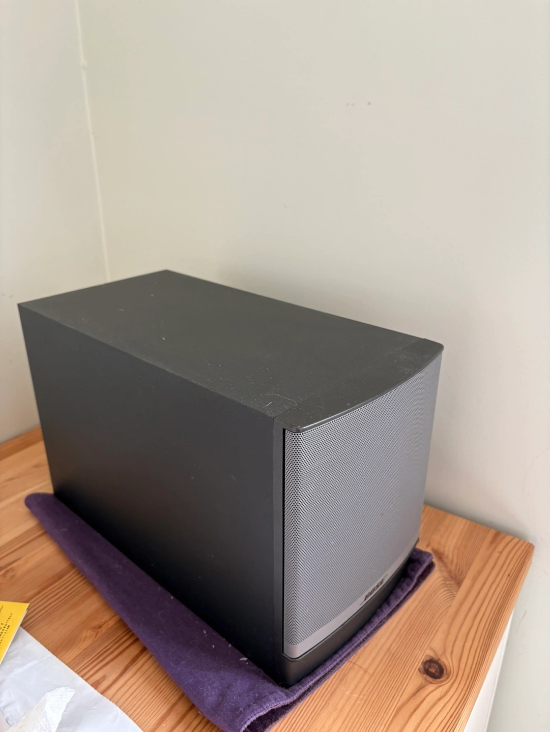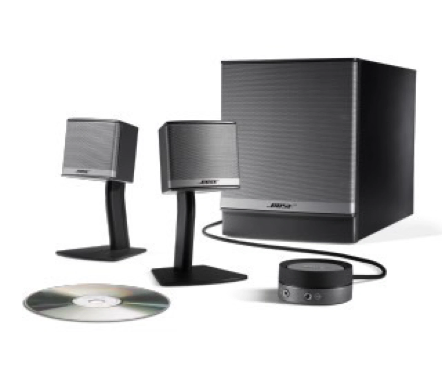 Black speaker system with a subwoofer and two satellite speakers. The system includes a control pod with volume, bass, and power controls.