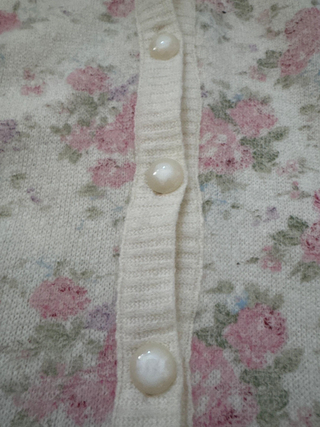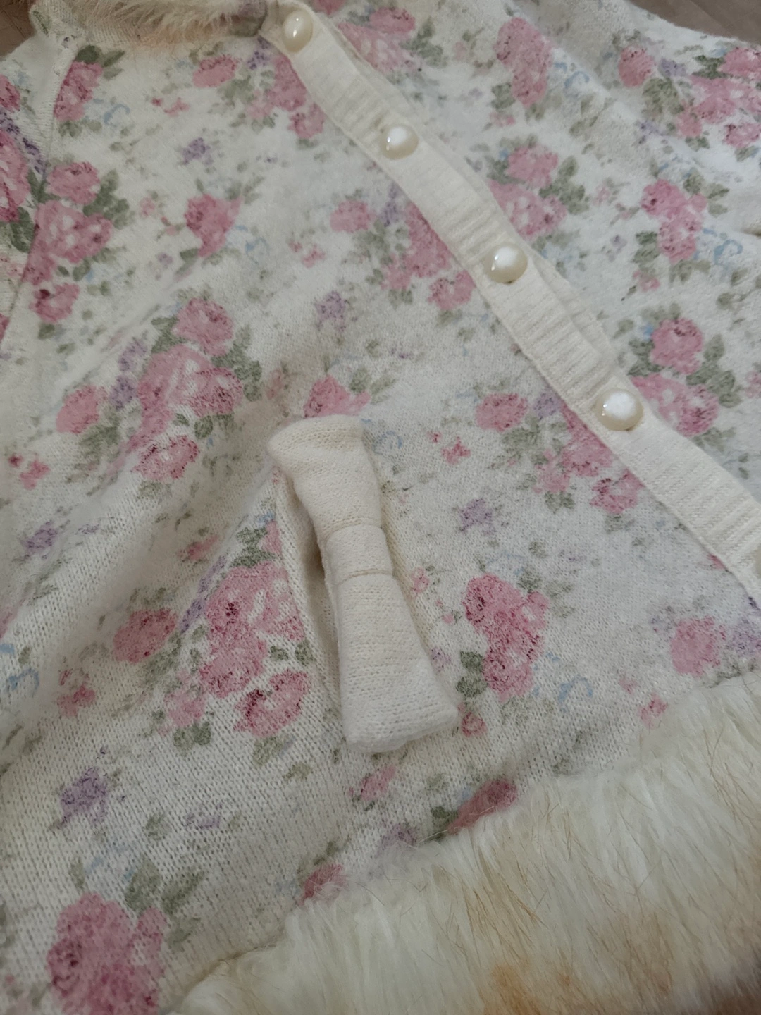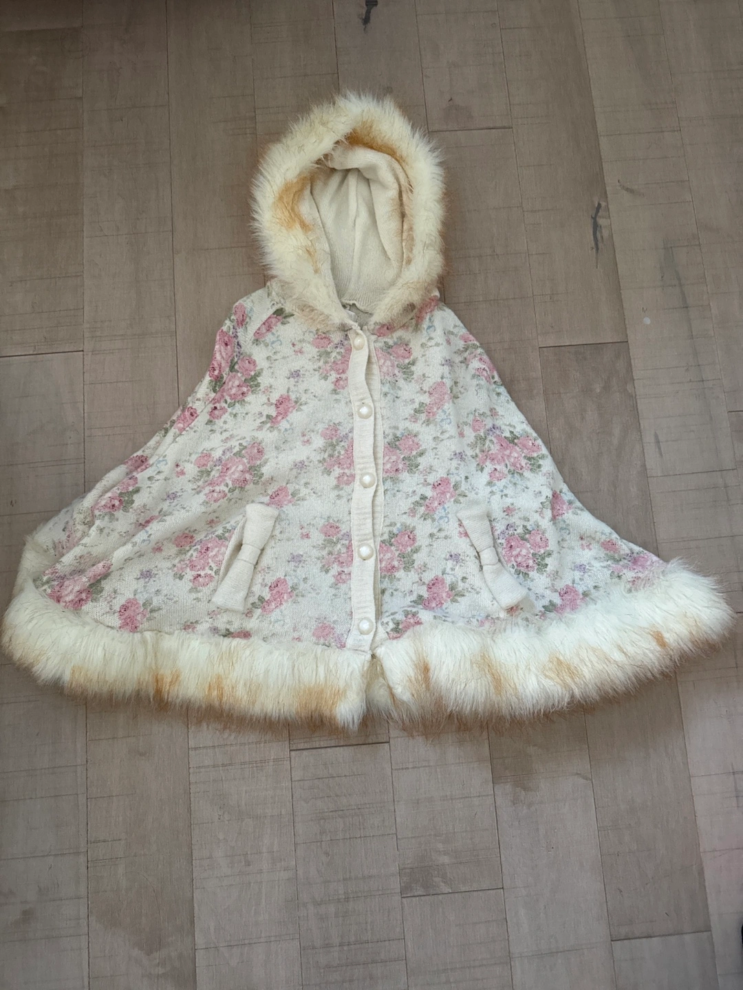 Knit cape with floral print and faux fur trim. Features a hood and button closure. Bow detail on pockets makes it super cute and pearl Vintage buttons adds charm!