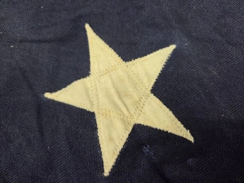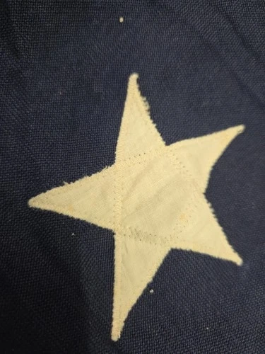 This is an authentic WWII era 48-star U.S. flag, measuring approximately 8 ft by 5 ft. It's made of cotton bunting with sewn, appliquéd stars featuring period machine zig-zag stitching and hand-sewn stripes. The flag has a heavy canvas hoist and metal grommets. It remains in original, unrestored condition with honest age wear, toning, and wrinkling consistent with its wartime use. No modern repairs or alterations have been made, and it has not been washed or cleaned. Let me know if you're interested!