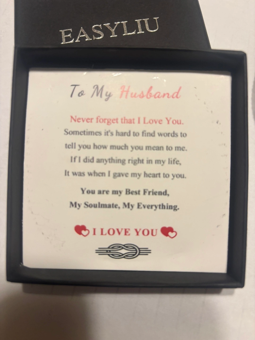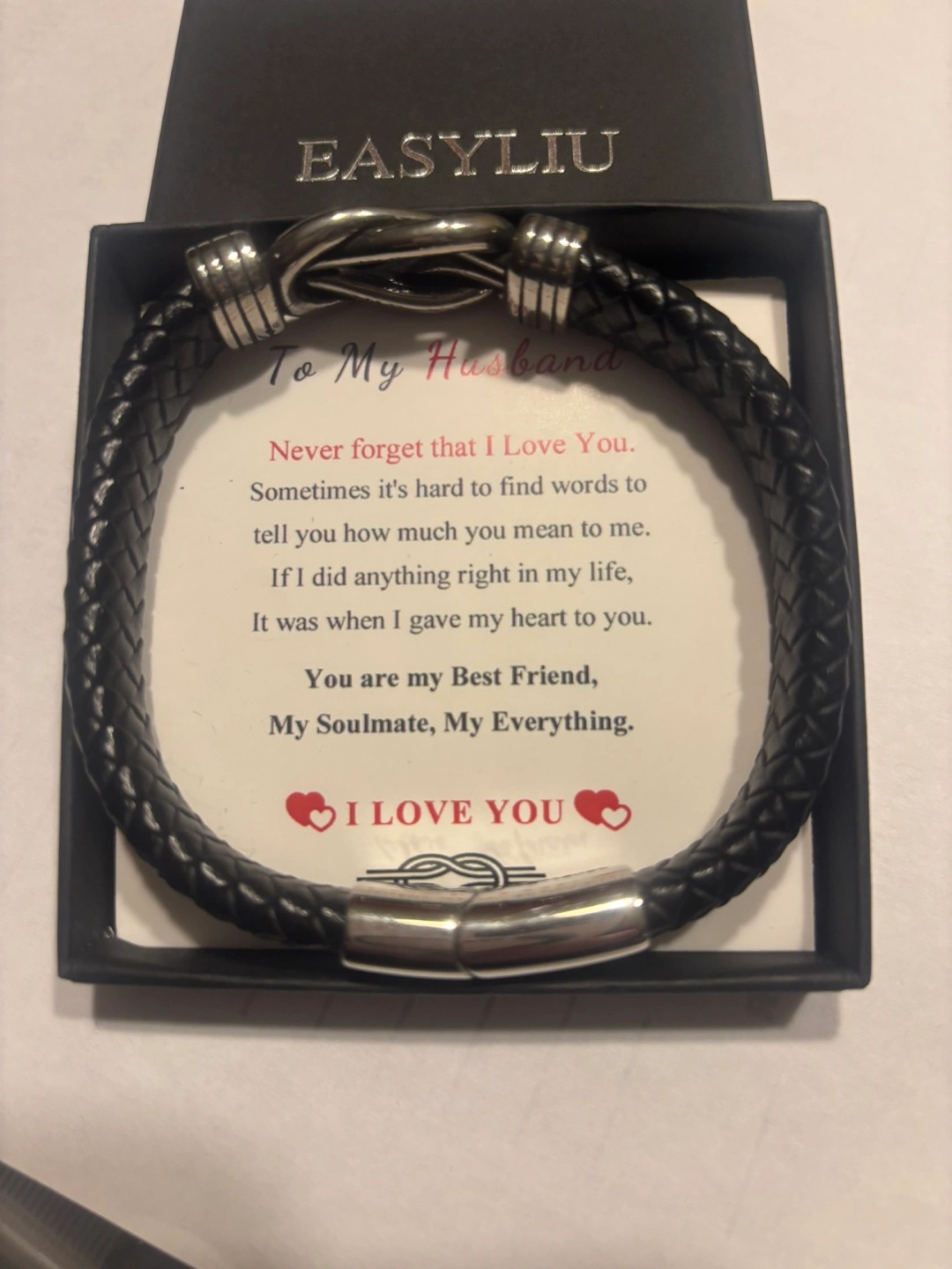 Black leather bracelet with a silver clasp. The clasp is engraved with 'love you forever'.