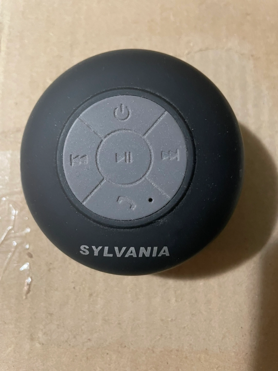 Small round Bluetooth speaker, waterproof with suction. Features play/pause, volume, and phone buttons.