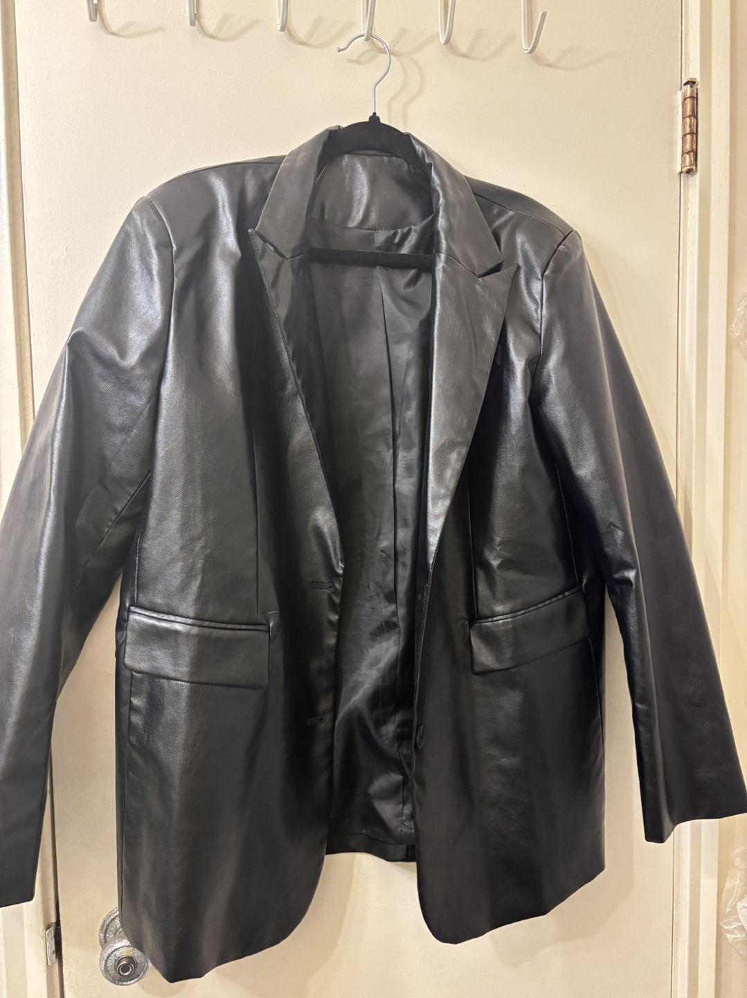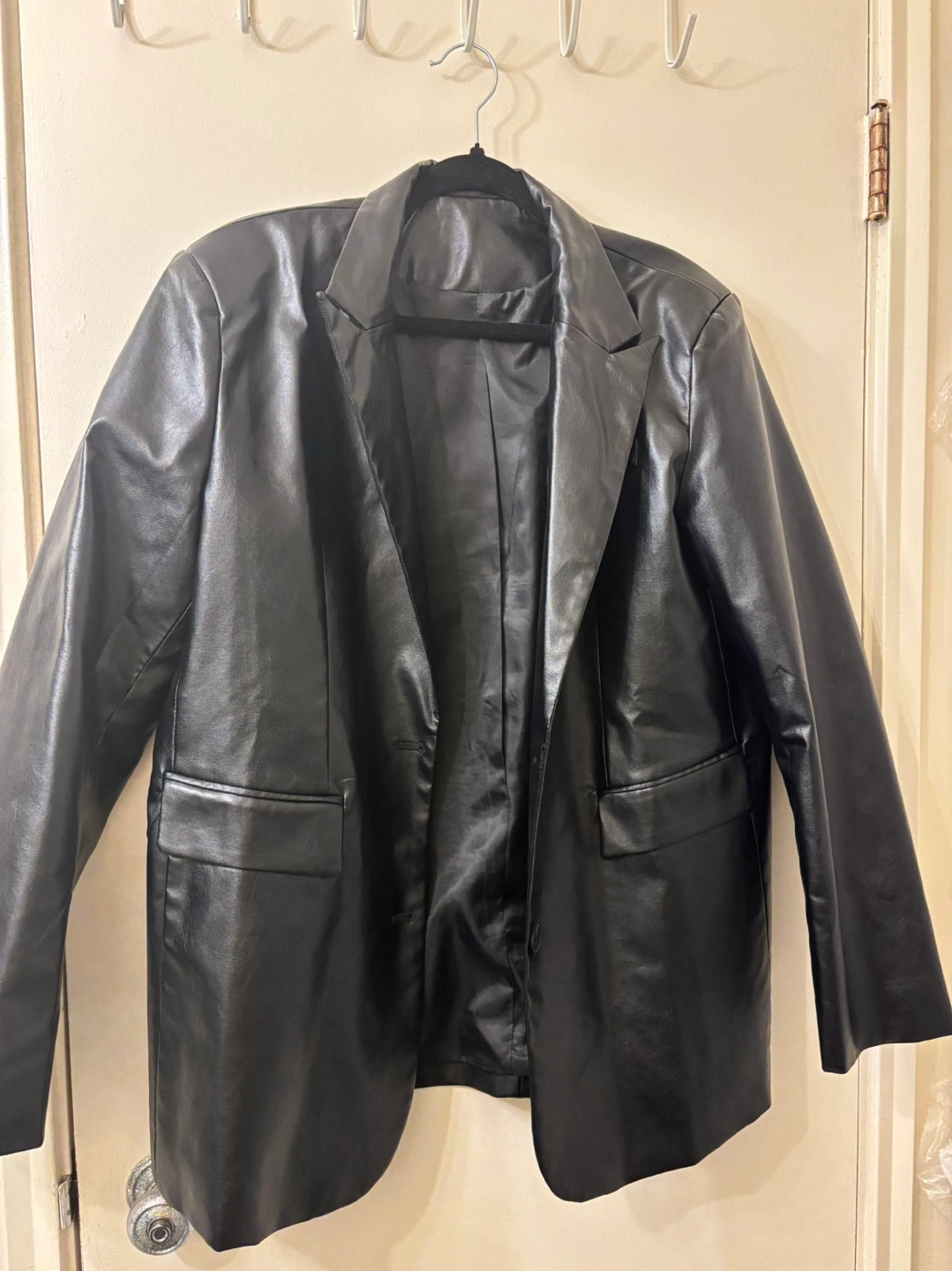 Black faux leather blazer. Two pockets, one button closure. Long sleeves.