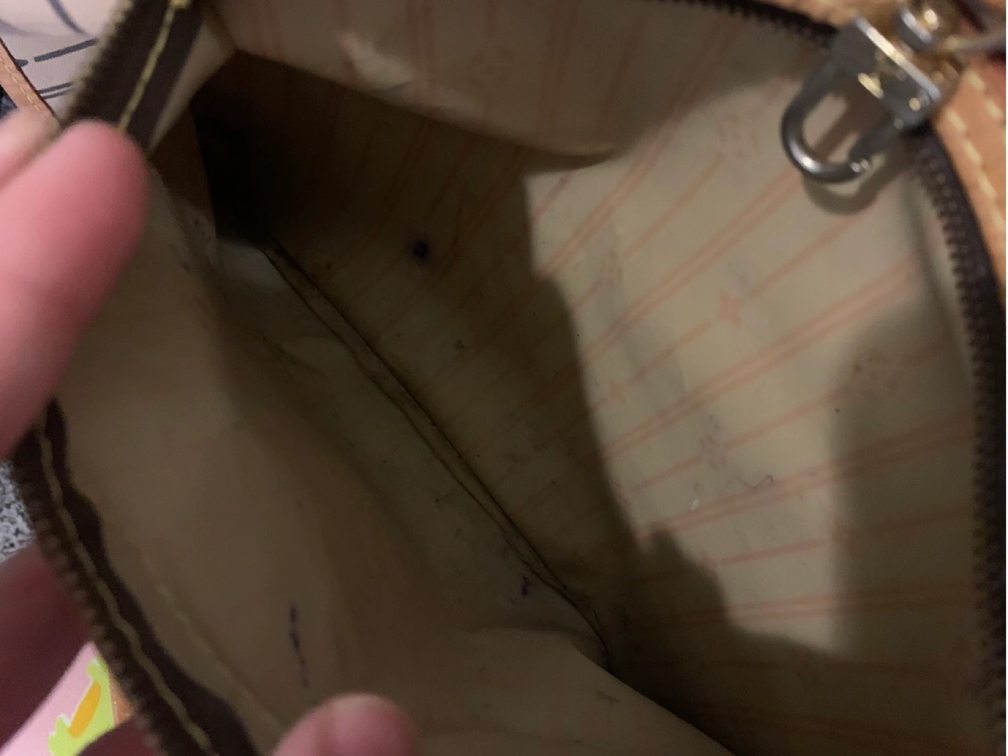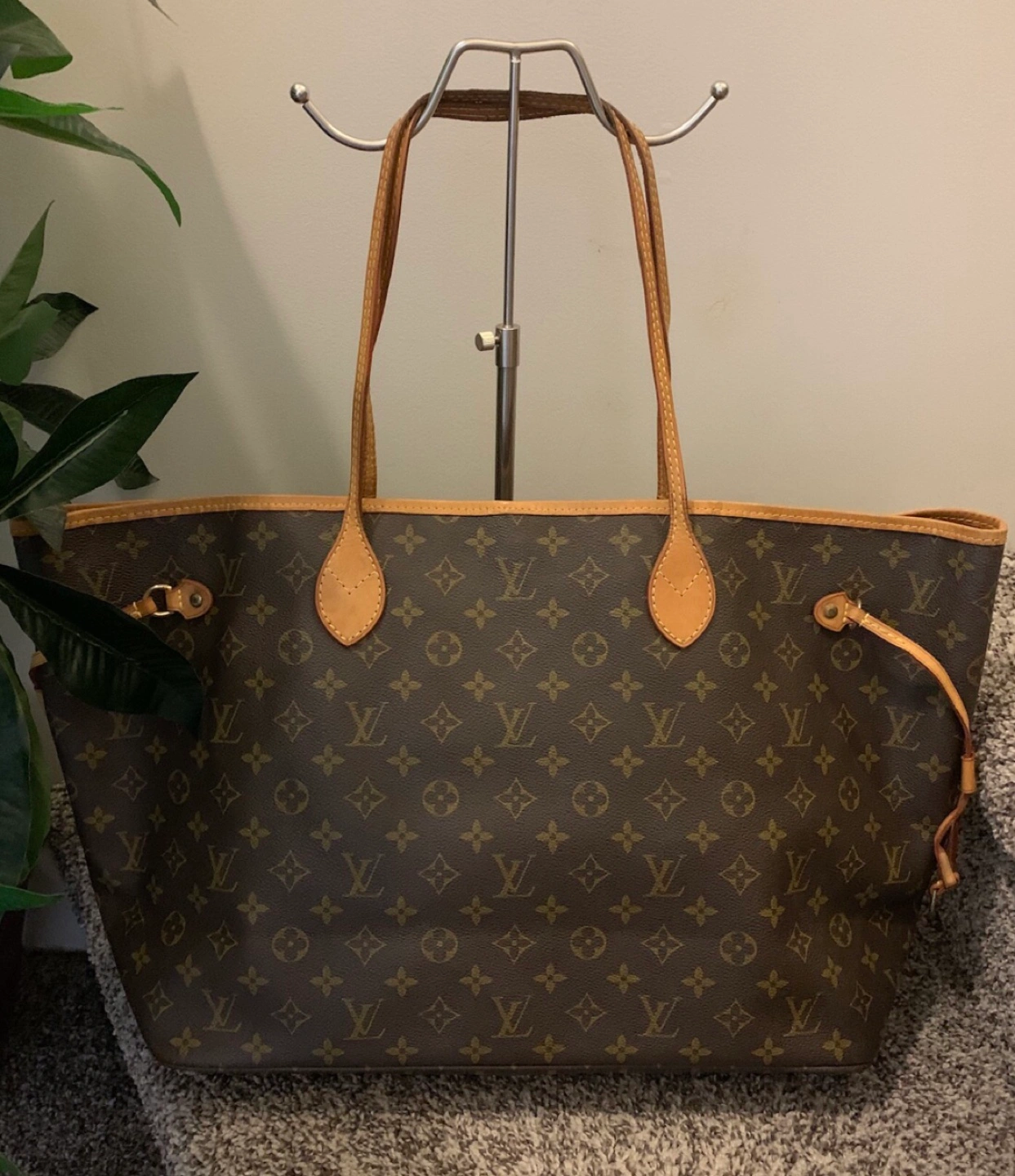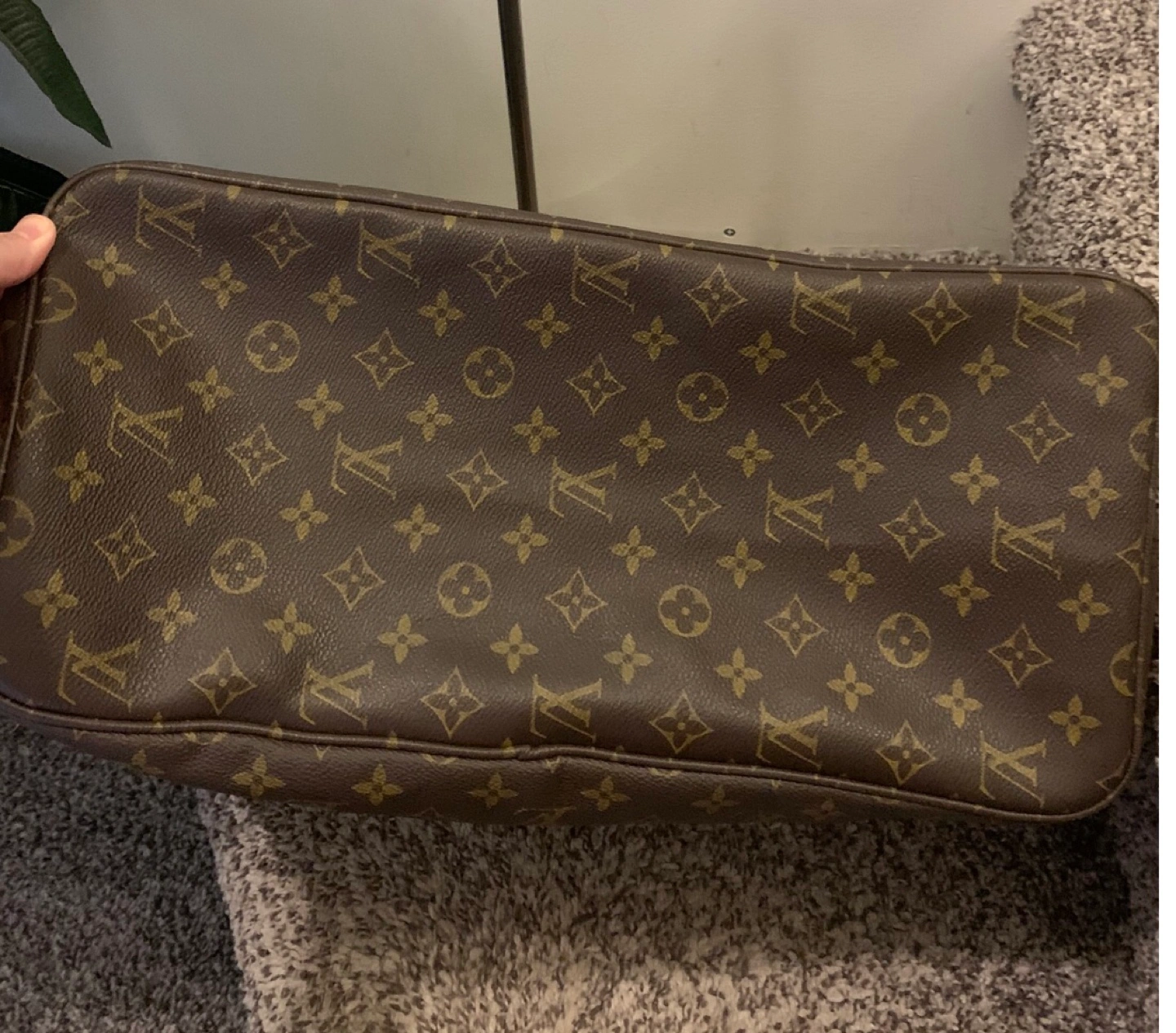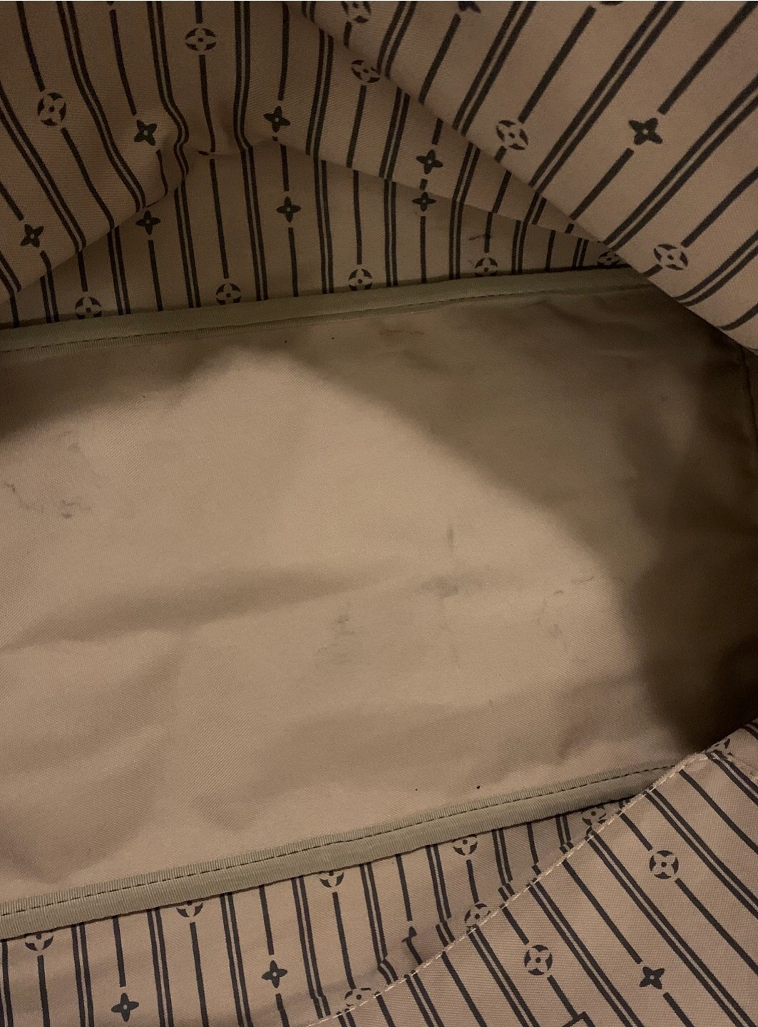 The largest size A few marks on inside lining Outside is clean and intact The inside hook closure is loose but doesn’t affect the purse Does not come with a pouchette Tons of space if you want to use overnight or as a diaper bag