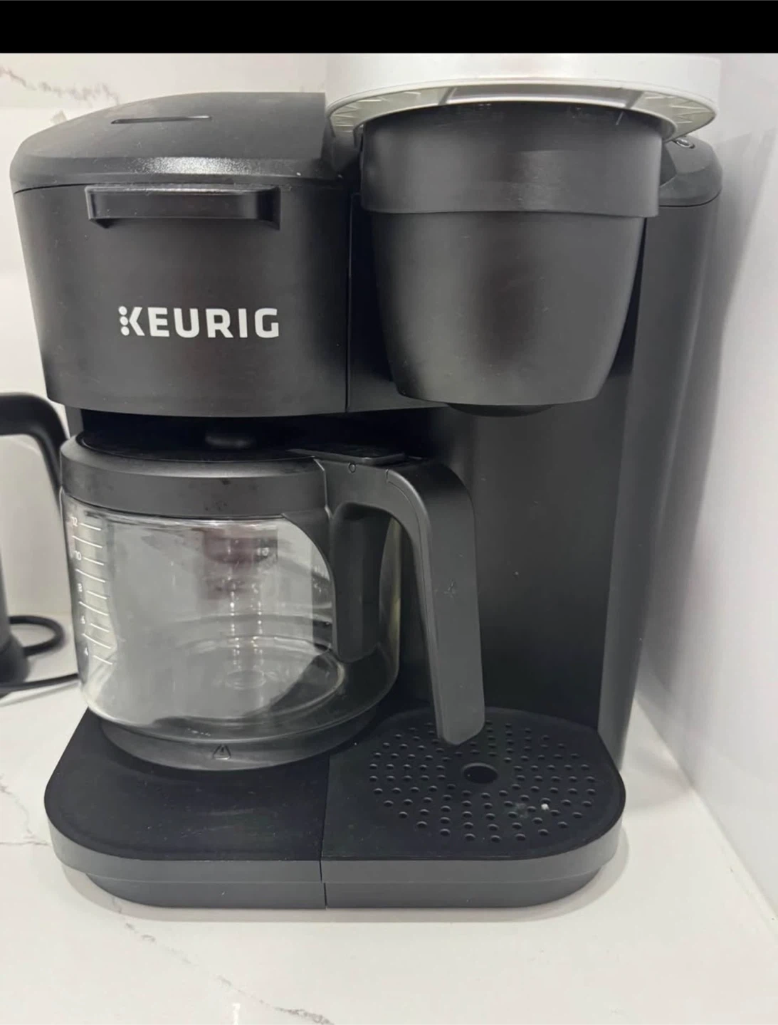 Black Keurig coffee maker with a glass carafe. It's a dual coffee maker, capable of brewing single cups or a full pot. Includes removable drip tray.